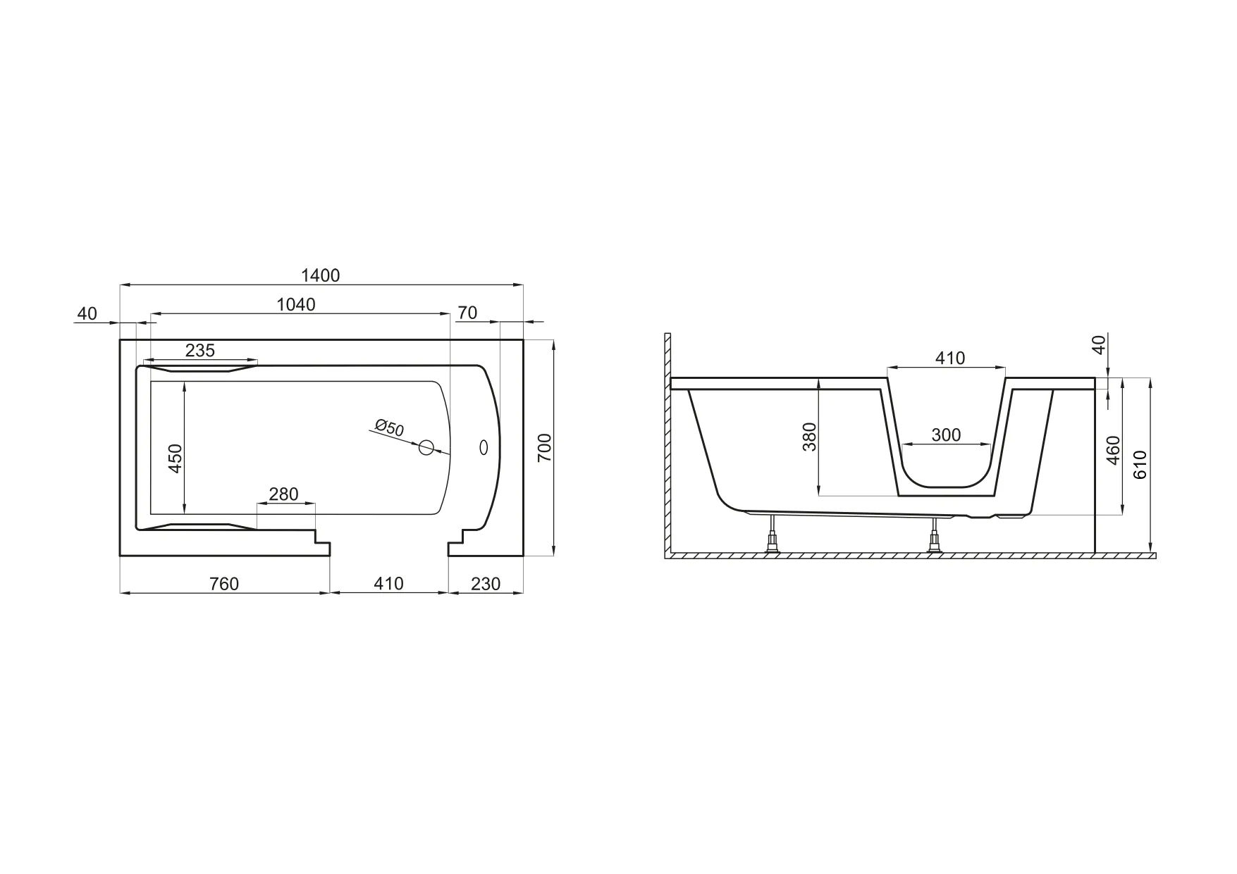 Акриловая ванна Polimat Avo 00306 140×70 пристенная с переливом белая