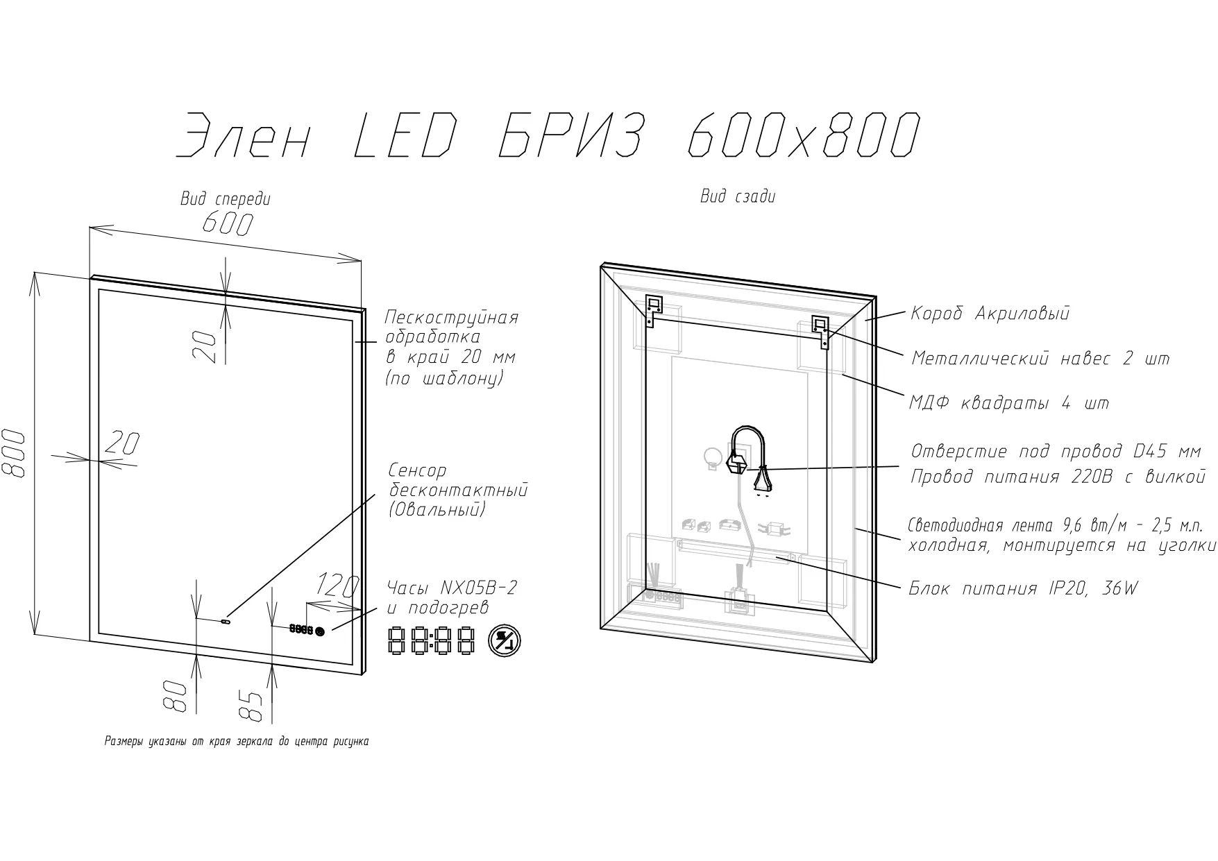 В комплект входят блок питания (36W) и сетевой шнур с креплением, что делает установку зеркала быстрой и простой.