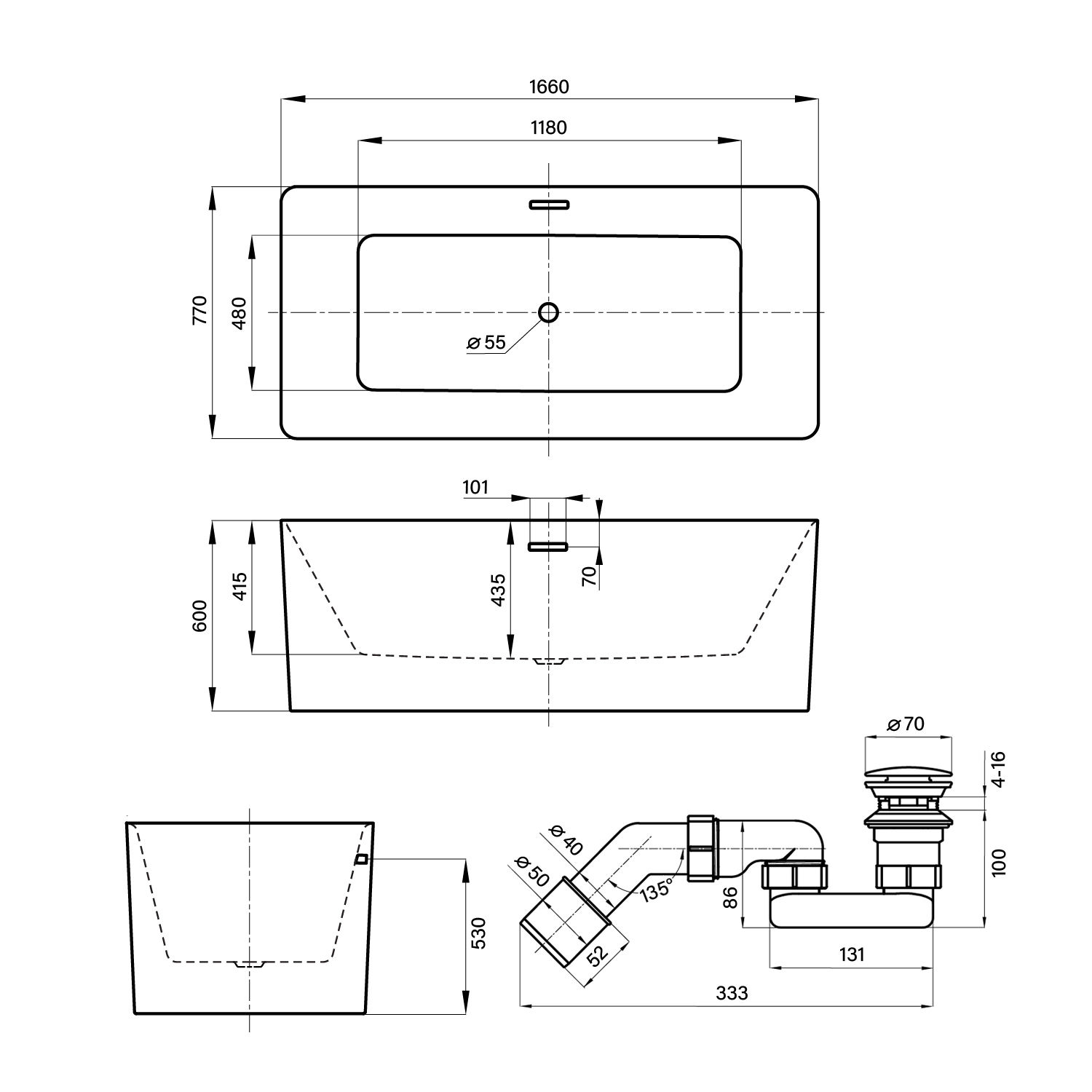Набор 4 в 1: ванна 230703000, ножки, экран, слив-перелив матовый черный 231919000.