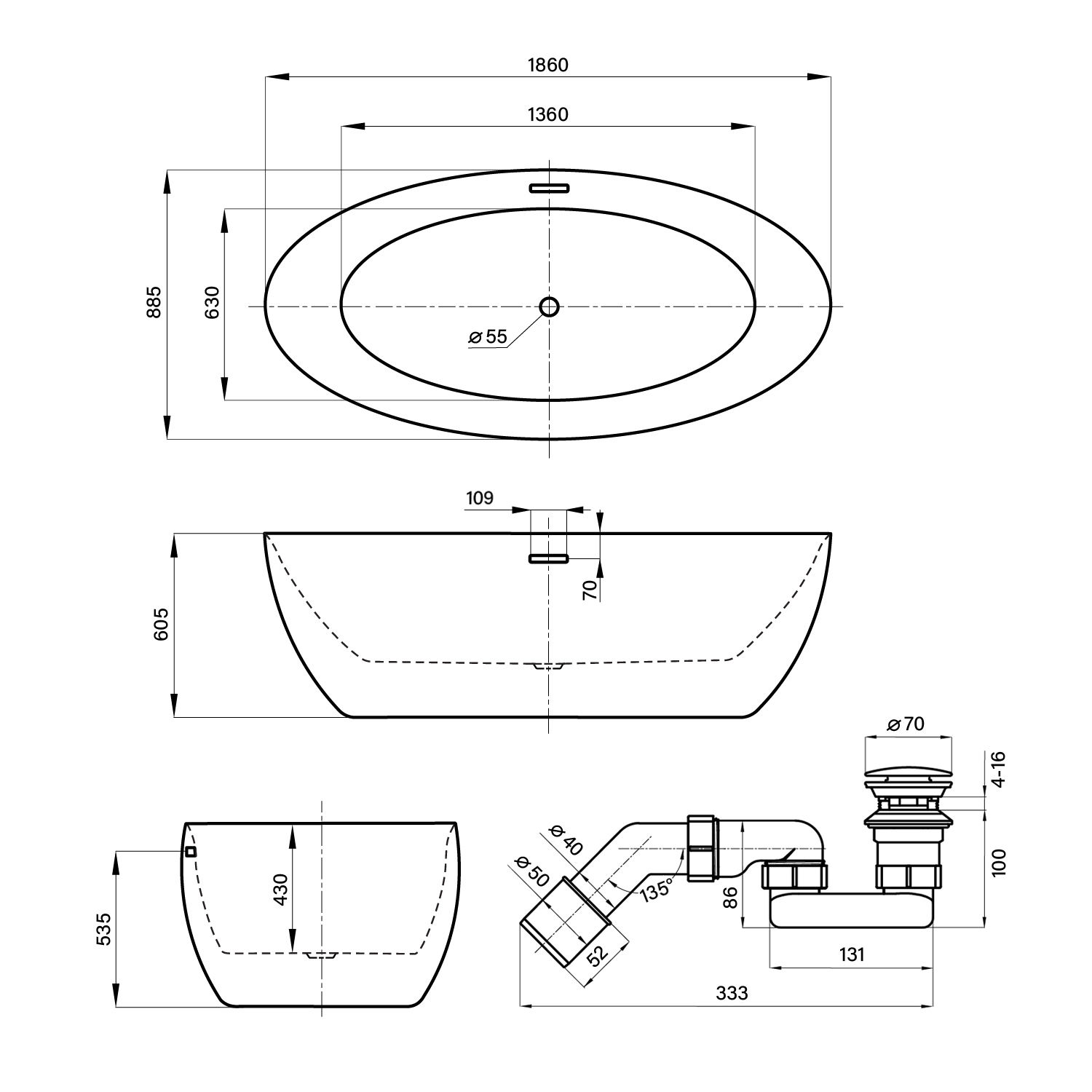 Набор 4 в 1: ванна 235601000, ножки, экран, слив-перелив матовый черный 231924000.