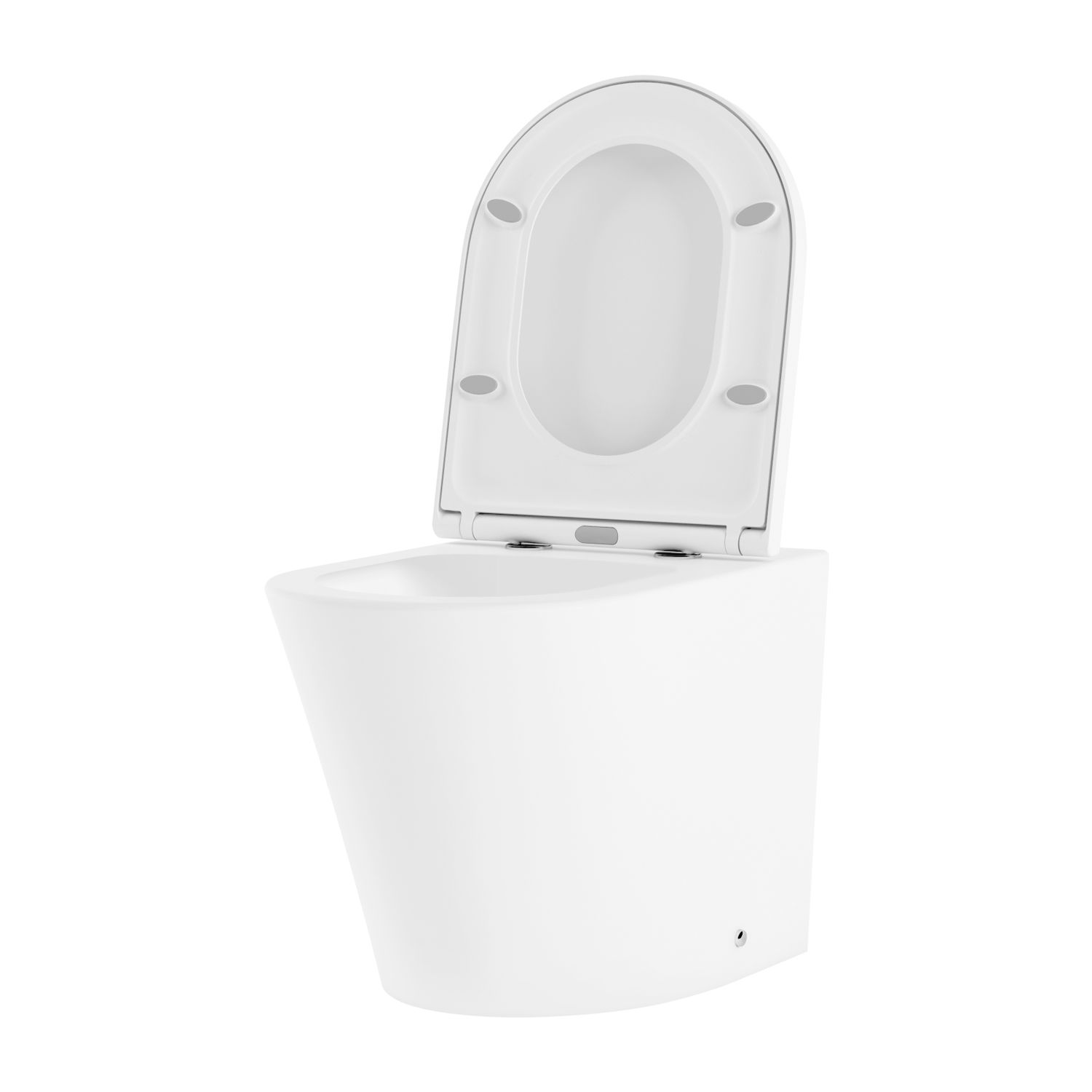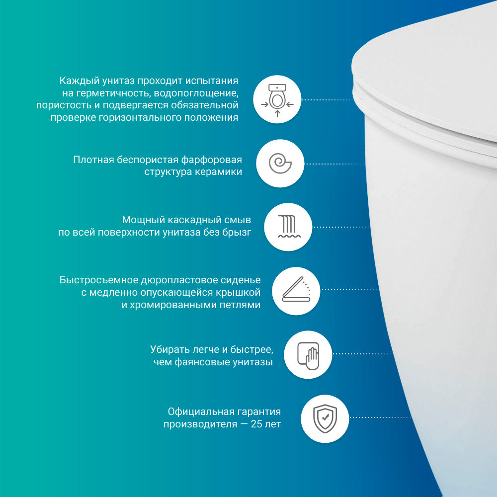 В стандартную комплектацию поставки входят: чаша унитаза, быстросъемное дюропластовое сиденье с медленно опускающейся крышкой и хромированными металлическими петлями, комплект крепления к полу, декоративные колпачки.