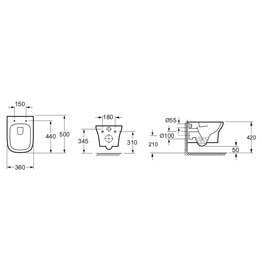 В комплектацию поставки входят: чаша унитаза, быстросъемное дюропластовое сиденье с медленно опускающейся крышкой и хромированными металлическими петлями, комплект крепления для подвесного монтажа, декоративные колпачки.