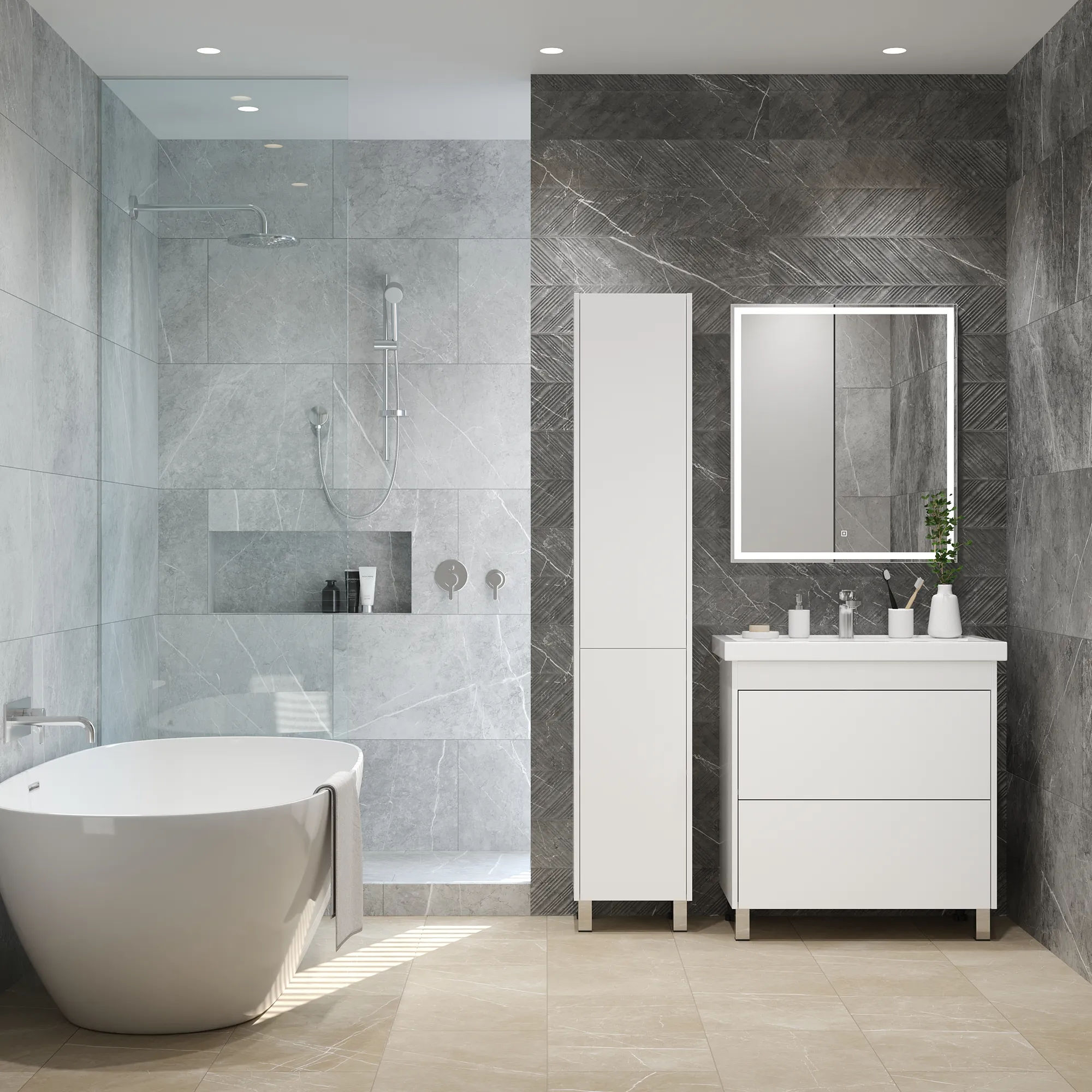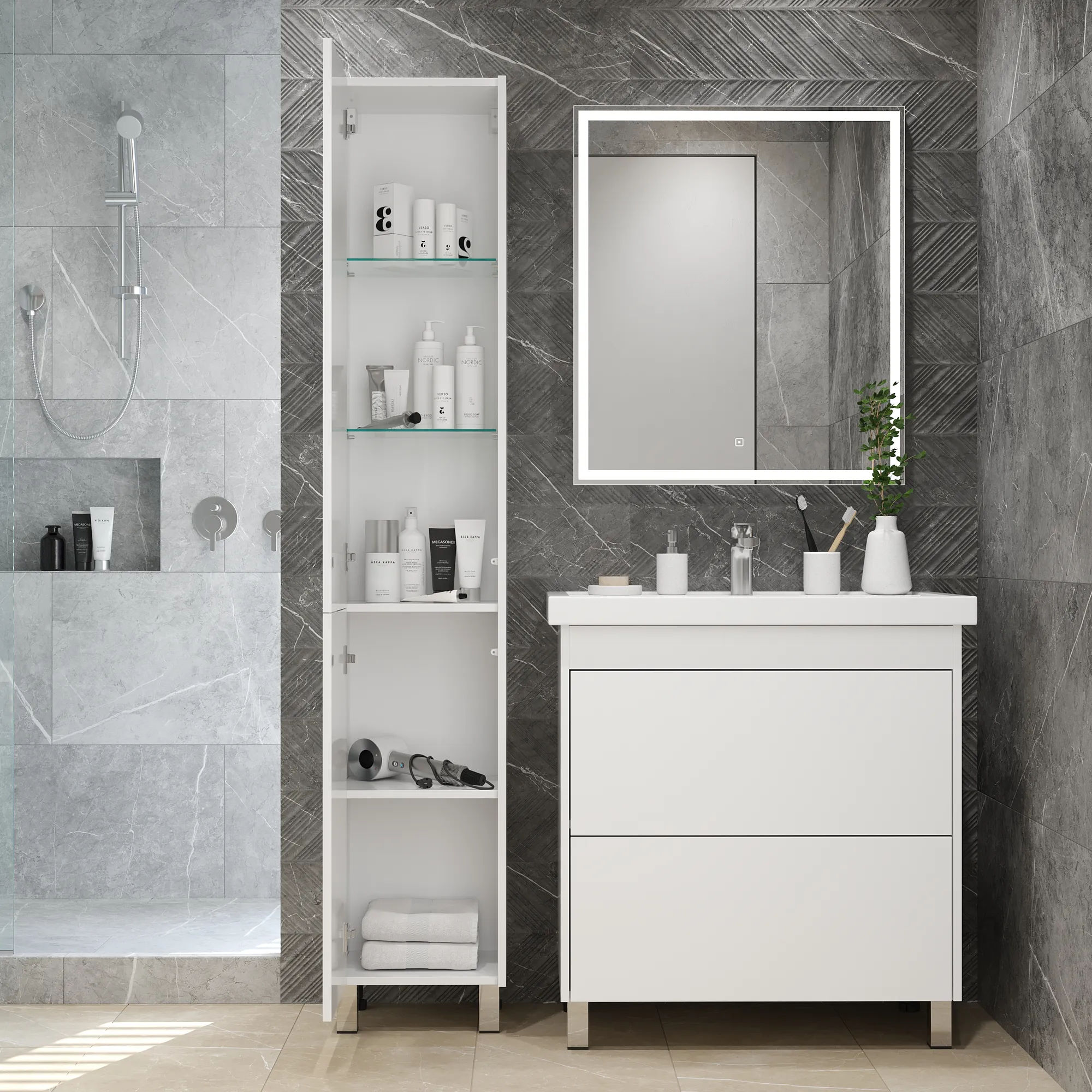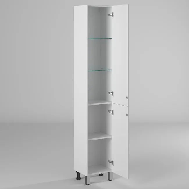 За двумя элегантными дверцами шкафа-пенала для ванной BRIZ Риччи 35 скрываются просторные полки из стекла и ЛДСП, которые позволят вам удобно хранить косметические средства и различные аксессуары. Шкаф оснащен системой push to open, что обеспечивает бесшумное и легкое открывание дверей с помощью механизма от компании Hettich.