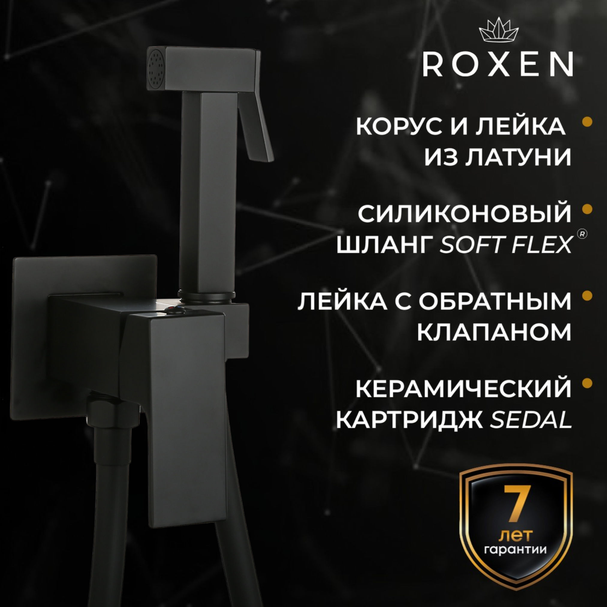 Смеситель встраиваемый Roxen Caspia 50096000-B с гигиеническим душем - стильная удобная модель в черном матовом цвете. Удобная ручная лейка с обратным клапаном, который предназначен для автоматического перекрытия обратного потока воды, что значительно экономит расход воды и защищает изделие от повреждений. Корпус смесителя изготовлен из высококачественной латуни марки MS-65, без содержания свинца и других вредных примесей. Смеситель имеет специальное покрытие, препятствующее образованию известковых отложений, что поможет избежать поломок и обеспечит более продолжительный срок эксплуатации изделия. Надежный керамический картридж устойчив к высоким температурам, имеет плавную регулировку напора и температуры воды. Износостойкий шток рассчитан на 500000 циклов. Смеситель имеет систему шумоподавления, которая обеспечивает бесшумную работу на протяжении всего срока использования. Прочное и износостойкое матовое покрытие устойчиво к механическим воздействиям и истиранию, практически не оставляет на себе следы от пальцев и капель воды. Держатель душевой лейки имеет силиконовую прокладку, которая позволяет избежать появление царапин. Силиконовый шланг с инновационной поверхностью Soft Flex имеет специальную защиту от заломов и перекручивания Anti-twist protection. Такой шланг не оставляет царапин и повреждений на сантехнике, полностью герметичен и надежен в использовании, благодаря гладкой поверхности прост в уходе.