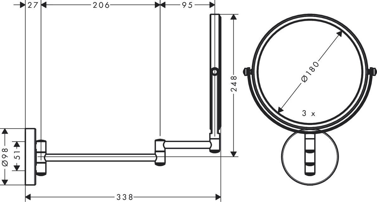 Представляем косметическое зеркало Hansgrohe Logis Universal — идеальный аксессуар для вашего туалетного столика или ванной комнаты, который сочетает в себе стиль и функциональность! Это настенное зеркало предлагает уникальное решение для ухода за собой. С одной стороны вы получаете идеально ровное отражение, а с другой — увеличительное зеркало с коэффициентом 3x, что позволяет детально рассмотреть каждую деталь вашего макияжа или ухода за кожей.