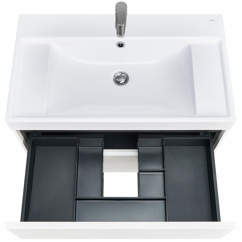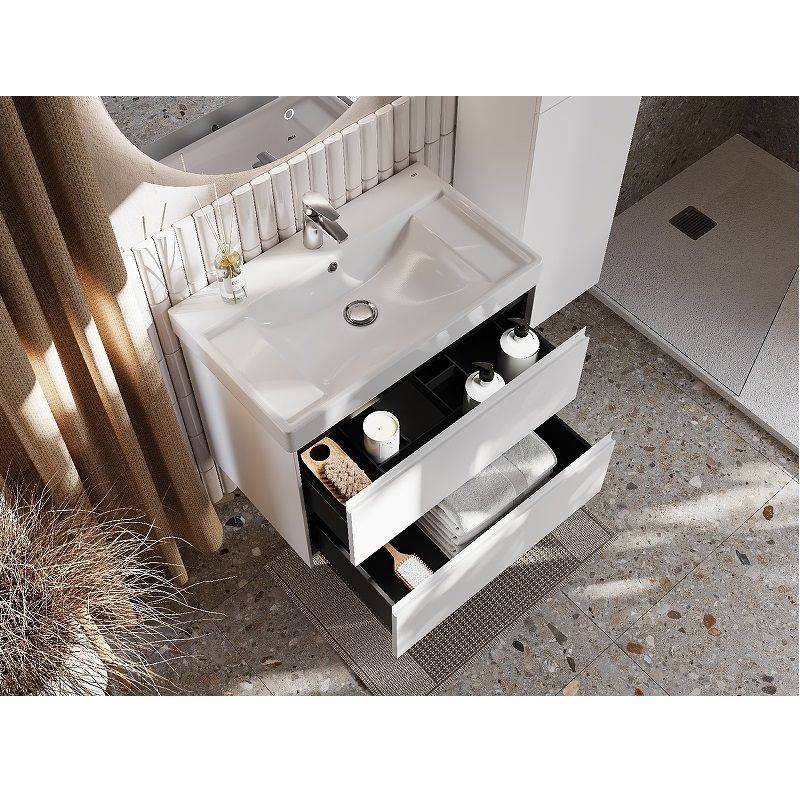 Тумба оснащена удобной металлической профильной ручкой, расположенной по всей ширине фасада. Она не только облегчает открывание ящиков, но и защищает мебель от влаги, ударов и износа, сохраняя ее элегантность и долговечность. Внутри каждого из двух выдвижных ящиков вас ждут противоскользящие коврики, а верхний ящик дополнительно оборудован встроенной системой организации пространства — для идеального порядка и эстетики в вашей ванной.