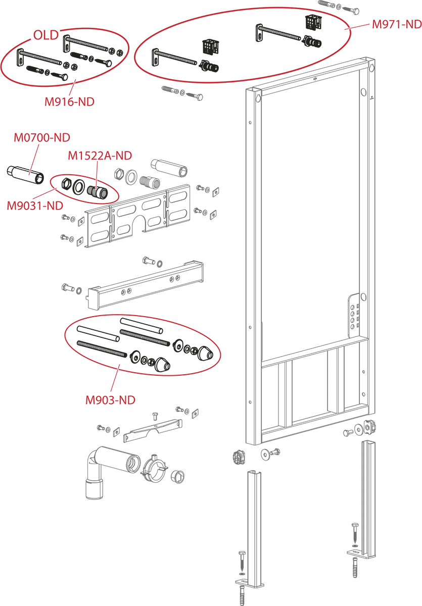 В комплекте: самонесущая рама, монтажный комплект (винт Ø8×60 – 4 шт., дюбель Ø12 – 4 шт.), монтажный комплект для крепления биде (шпилька М12 – 2 шт., шайба – 4 шт., колпачок – 2 шт., гайка – 2 шт., гофрированный рукав – 2 шт.), резьбовое соединение для подключения воды (G1/2"–G1/2").