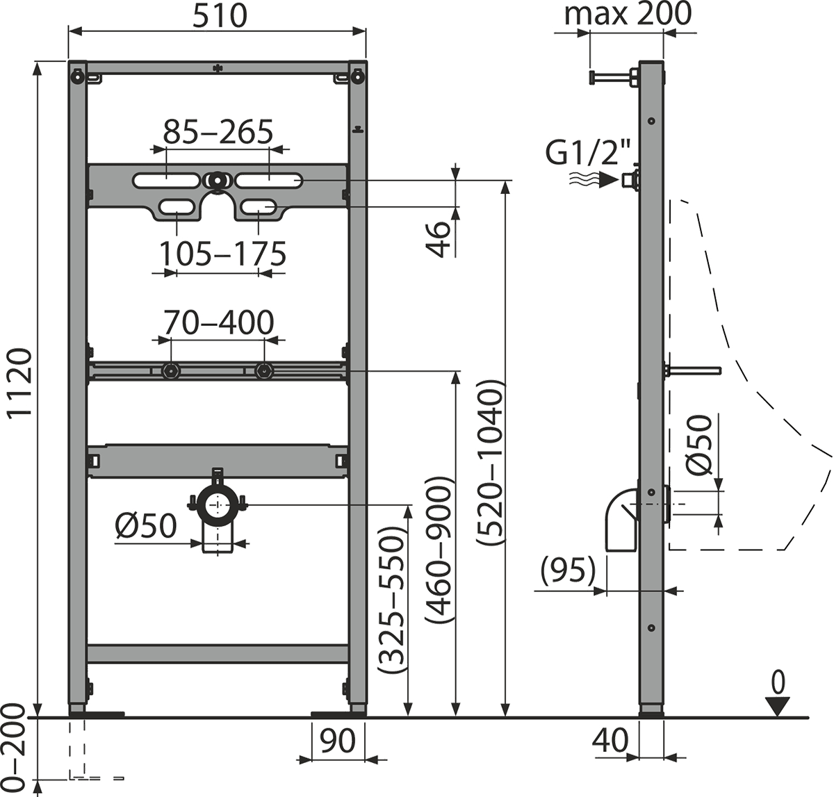 Инсталляция для писсуара AlcaDrain (AlcaPlast) A107/1120 с несущей способностью 150 кг — идеальное решение для подвесных писсуаров и монтажа устройств смыва под давлением. Подходит для установки к несущей стене или гипсокартонной конструкции, совместима с устройством смыва ATS001. Оснащена регулируемыми по высоте монтажными перекладинами и выдвижными ножками (0–200 мм) с тормозной системой. Водоснабжение и сток регулируются от центра (0–125 мм и 0–110 мм соответственно). Прочная металлическая рама с порошковым покрытием обеспечивает надежность и долговечность.