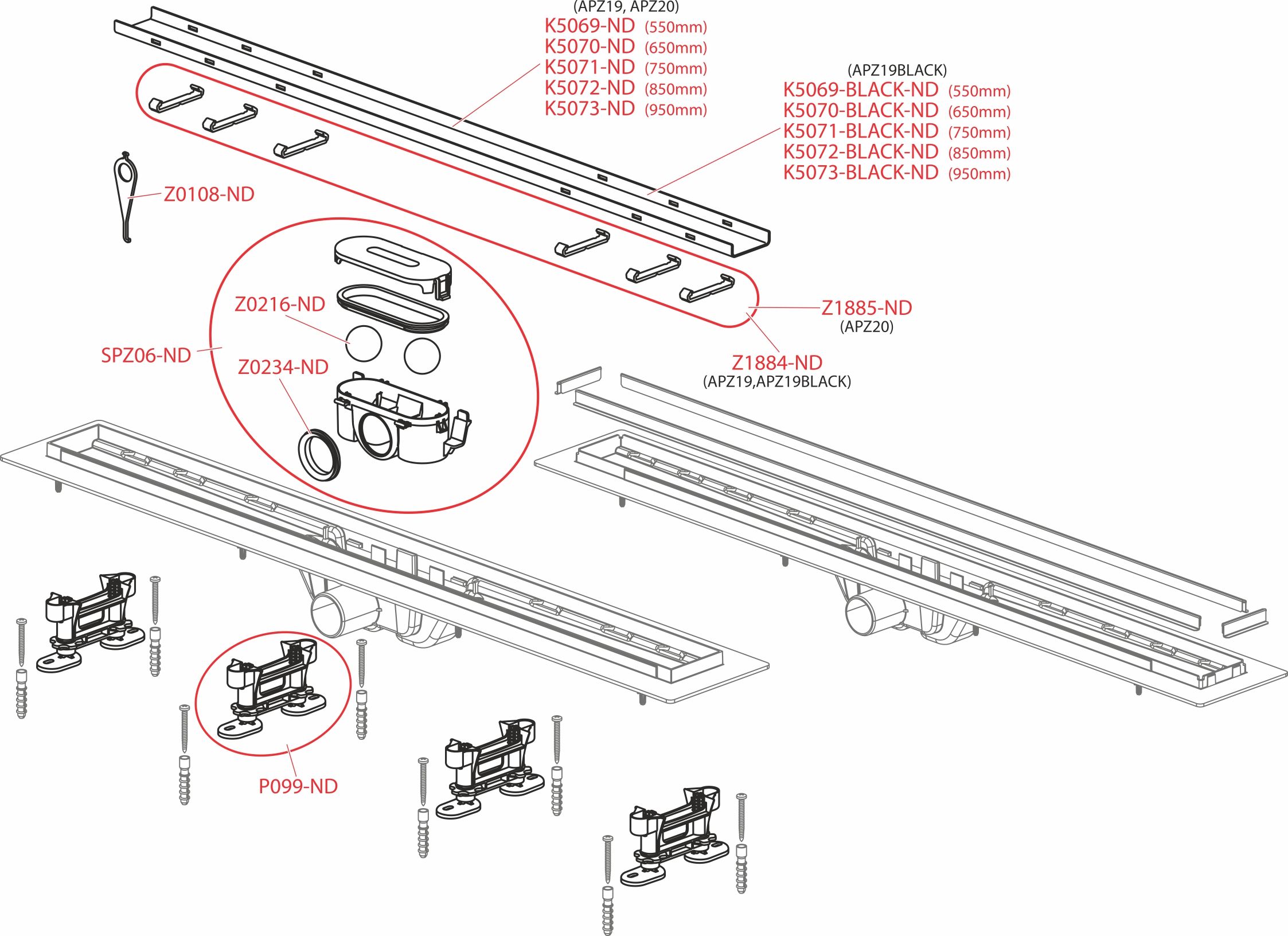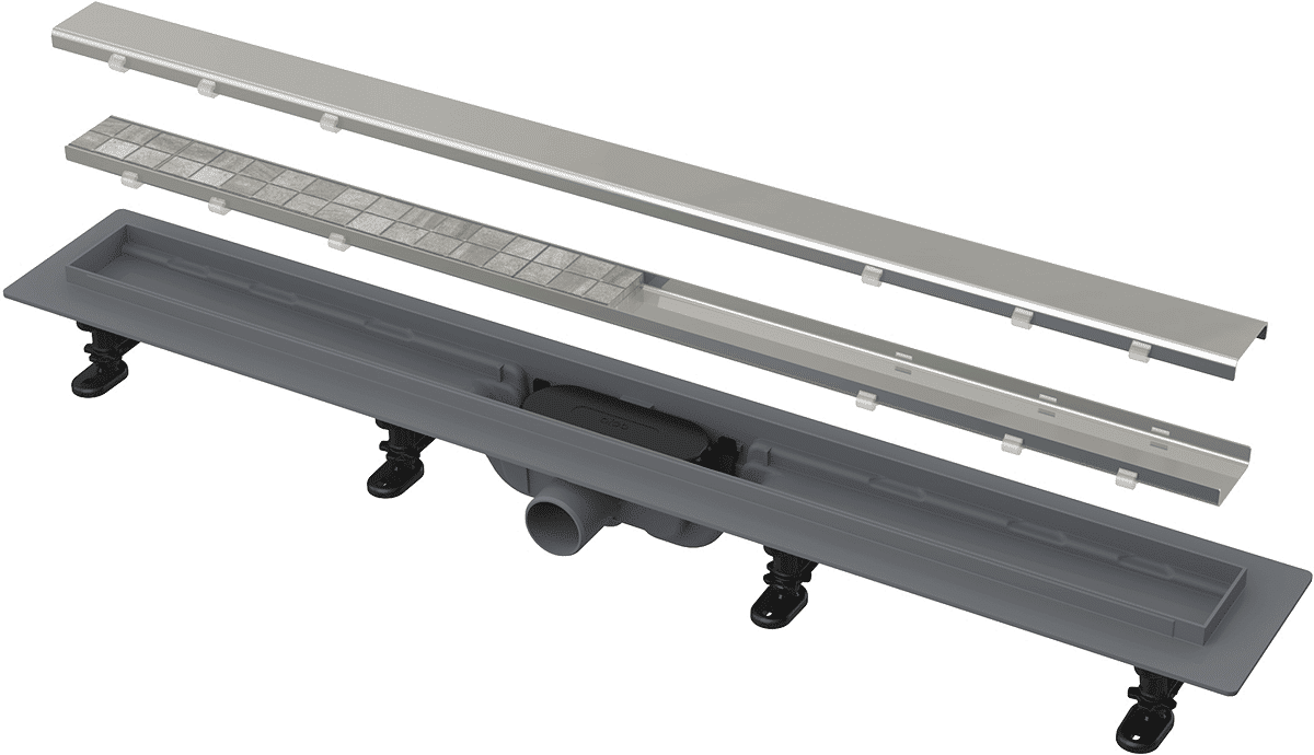 В комплекте: водоотводящий желоб, двусторонняя решетка (цельная решетка или решетка под кладку плитки), монтажный комплект (винт Ø4,2×38 – 4 шт., дюбель Ø8 – 4 шт.), самоклеящиеся гидроизоляционные ленты, гидрозатвор (комбинированный SMART), регулируемые по высоте ножки (2 шт.).