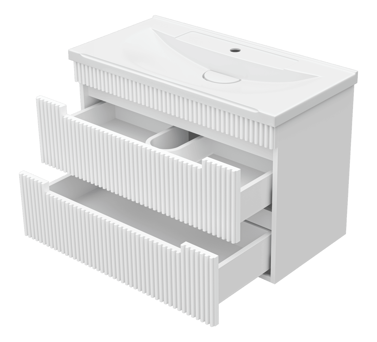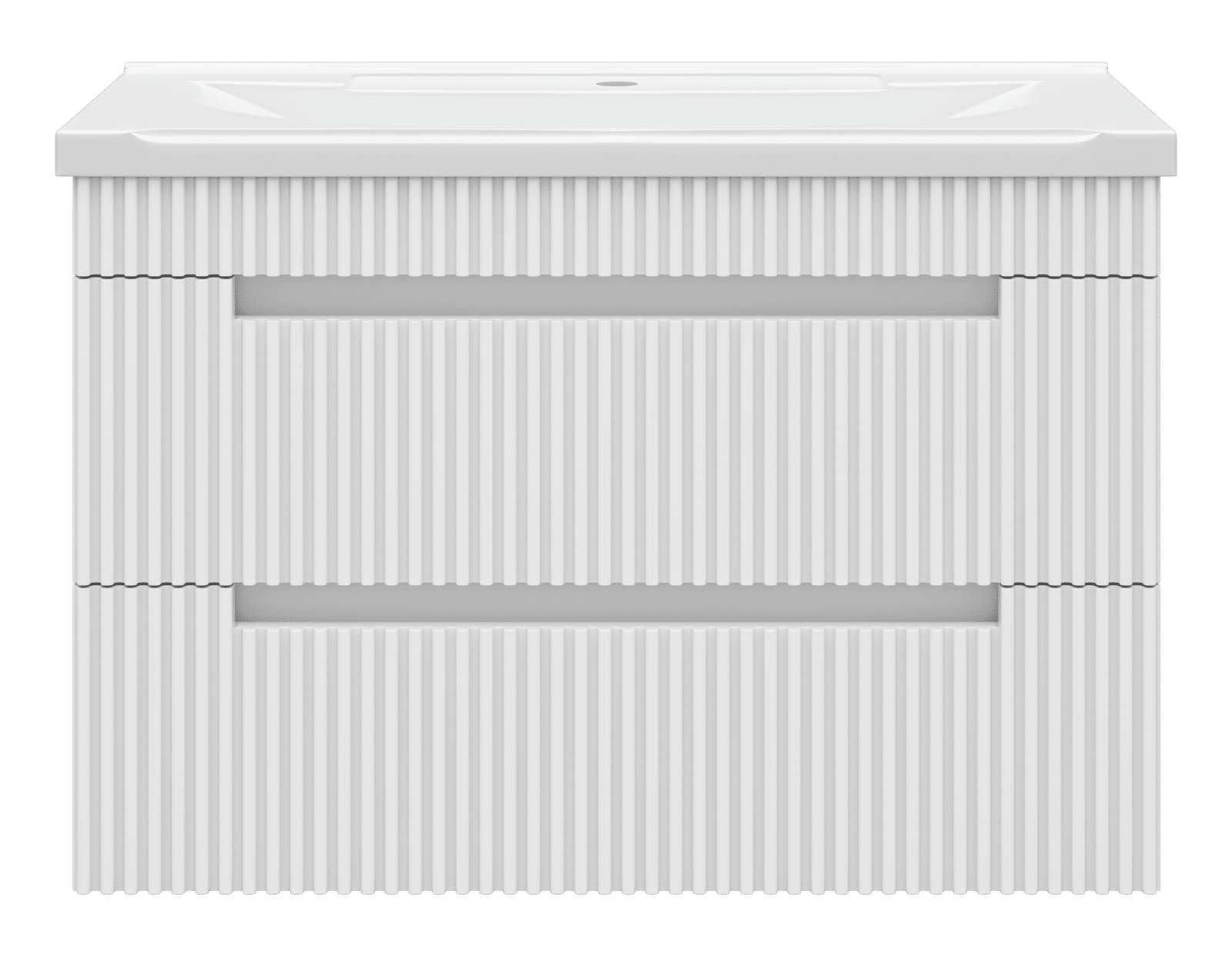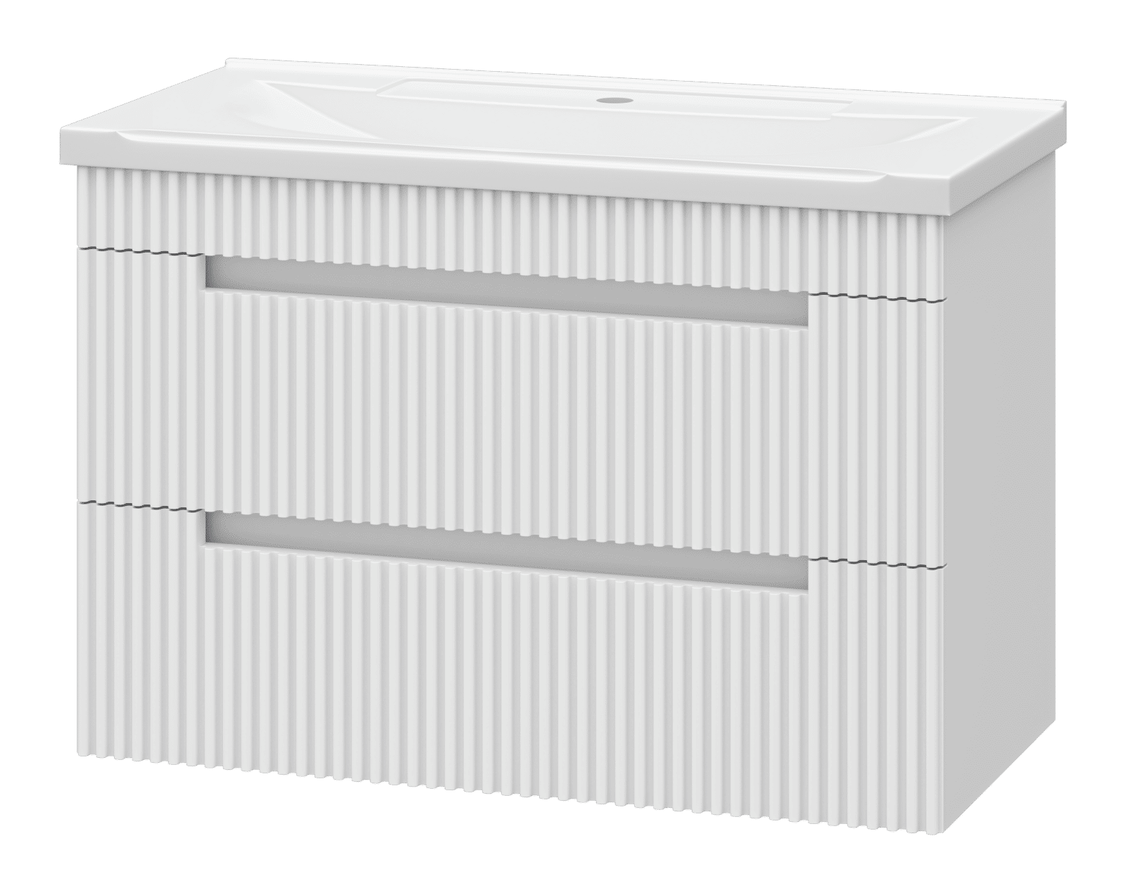 Тумба крепится на стену и украшена фрезеровкой на фасадах, что придает мебели стильный и оригинальный вид. Отличительная особенность коллекции: отсутствие внешней фурнитуры. Ящики открываются благодаря удобной ручке-пазу.