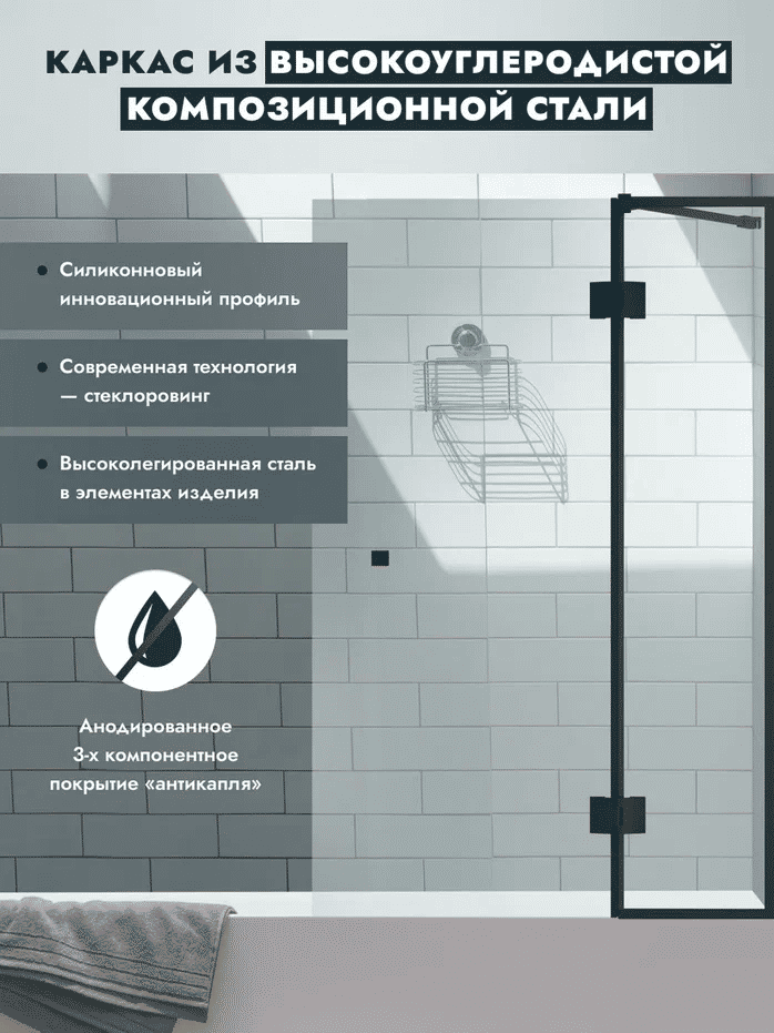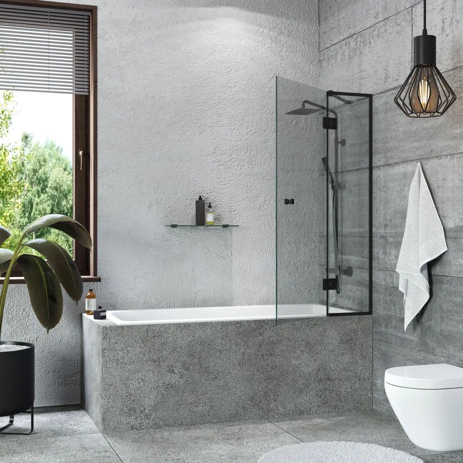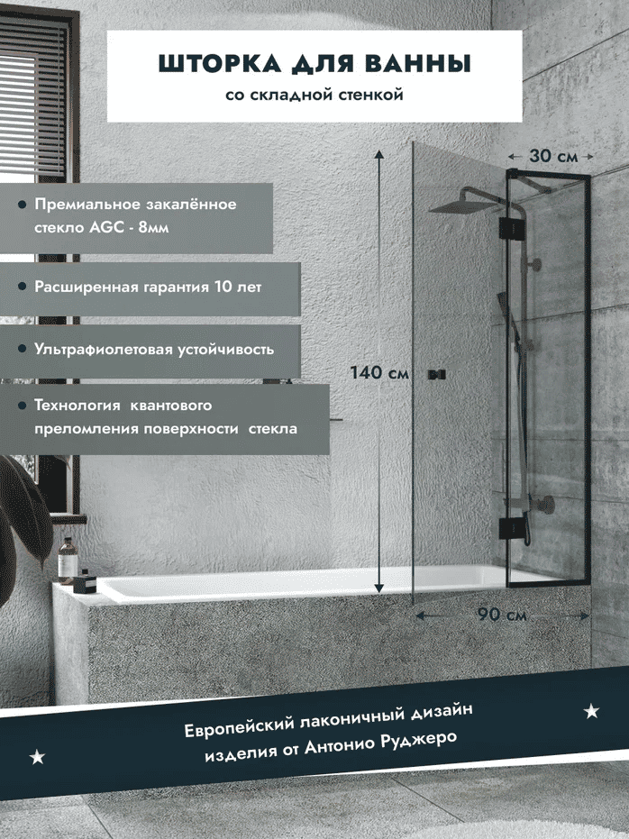 Шторка на ванну Benetto стладывается одна стенка 1400×900 (300/600) / BEN-401_BL_C черный + прозрачное стекло