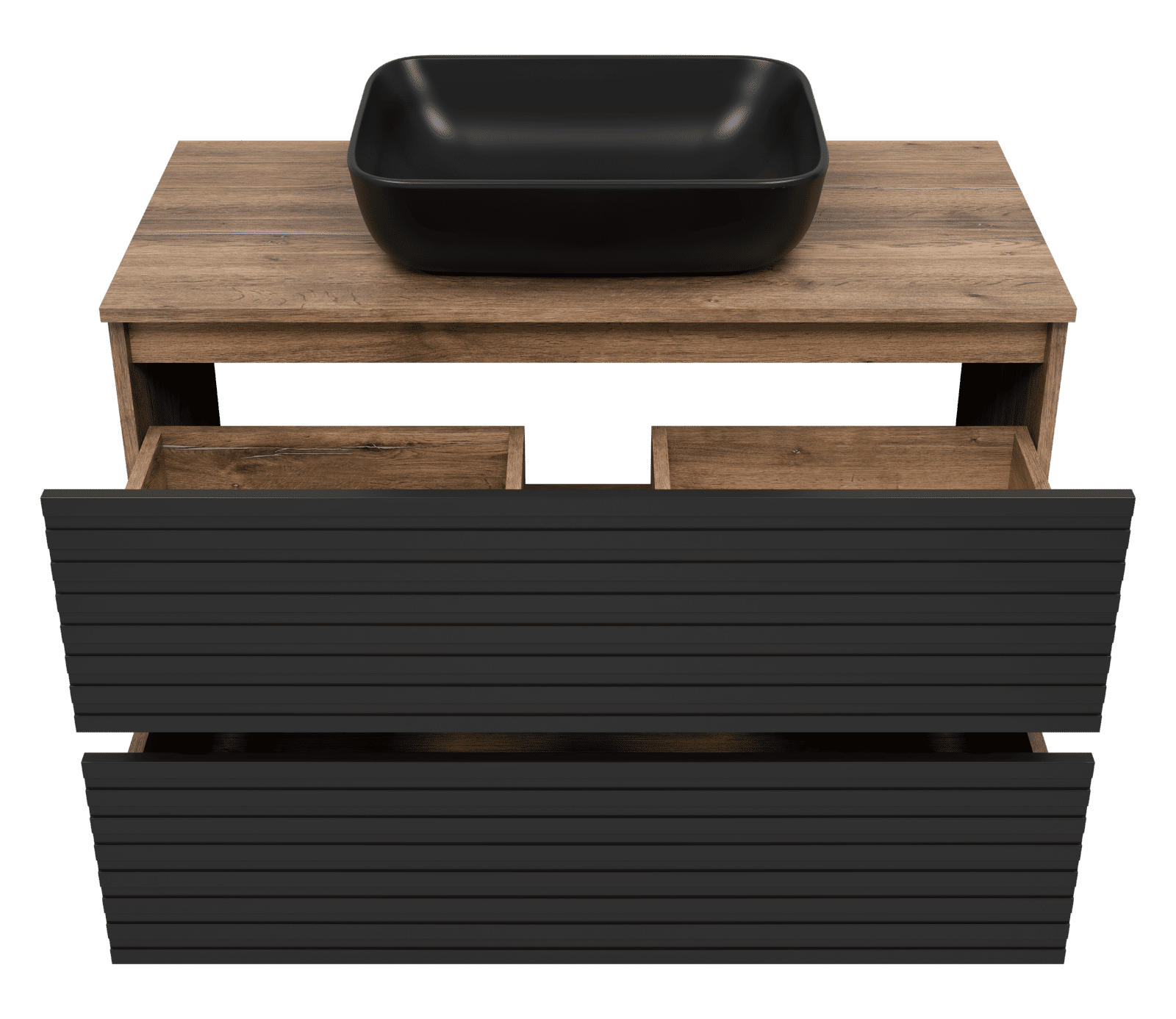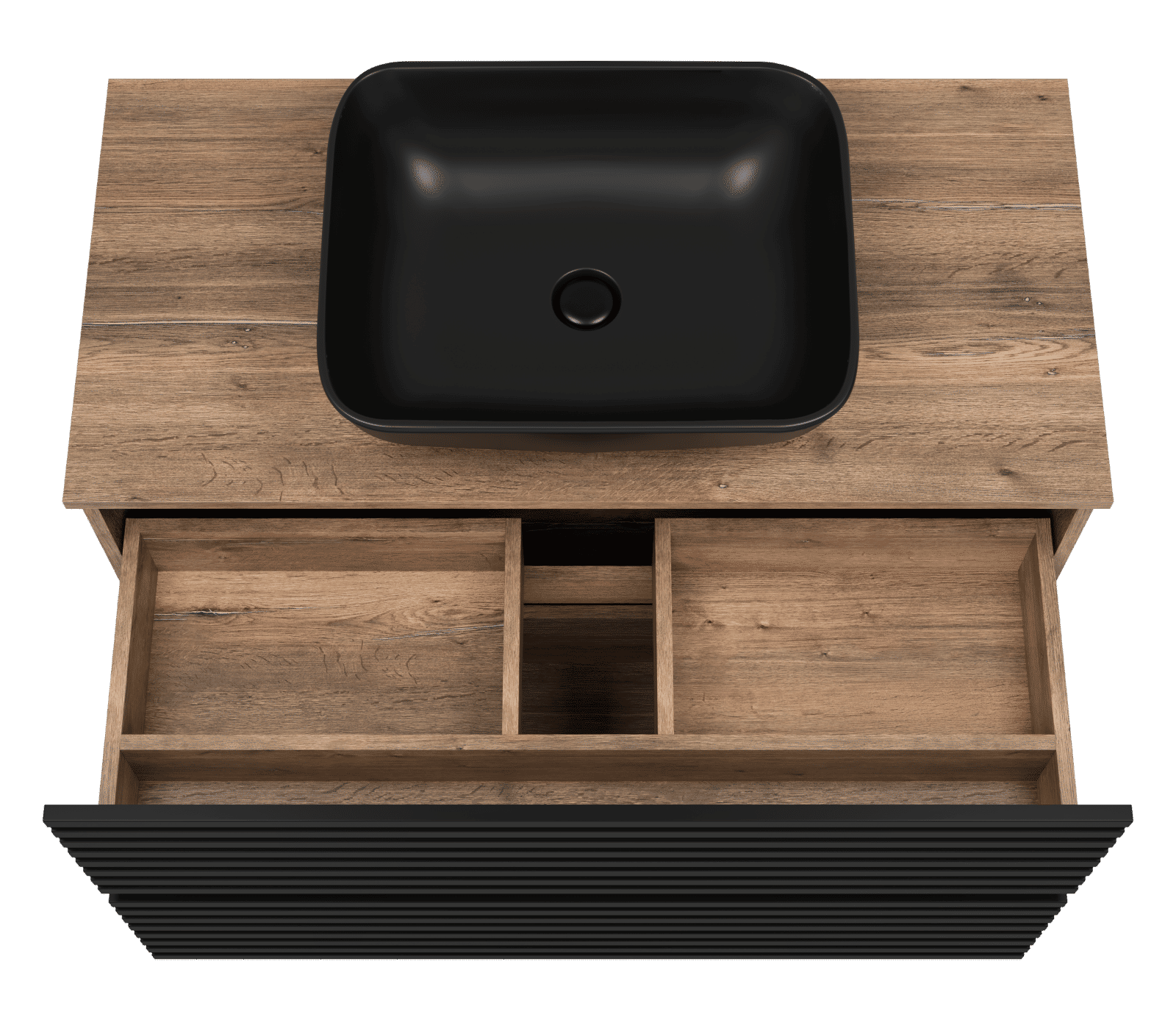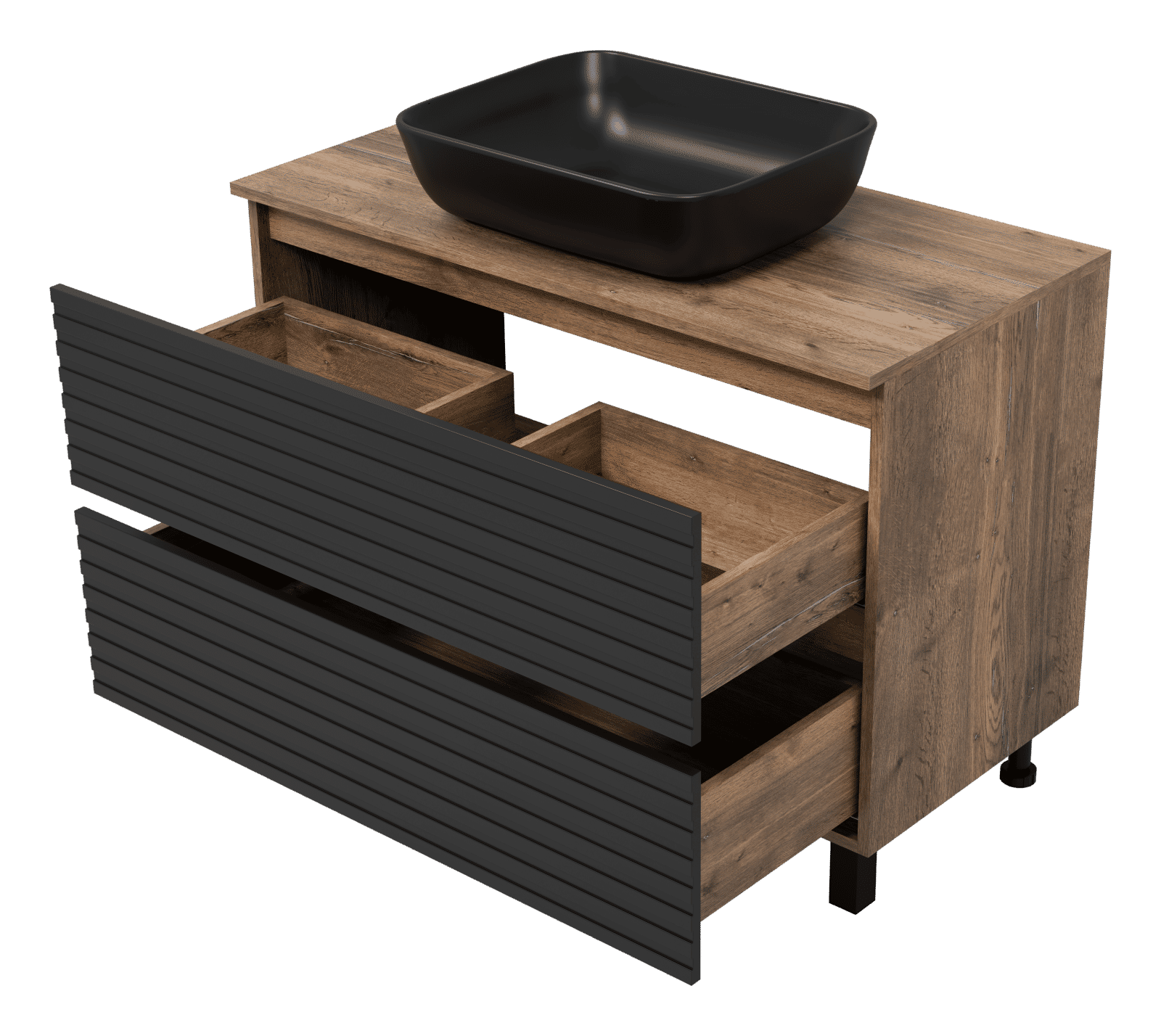 Тумба оснащена двумя выдвижными ящиками, которые установлены на направляющих скрытого монтажа с доводчиками. Верхний ящик разделен на несколько отсеков перегородками. Тумба поставляется с цельной столешницей без отверстий, что позволяет выбрать удобное расположение накладной раковины.