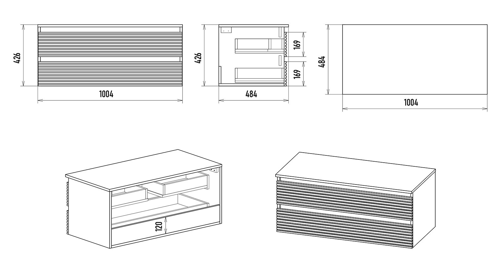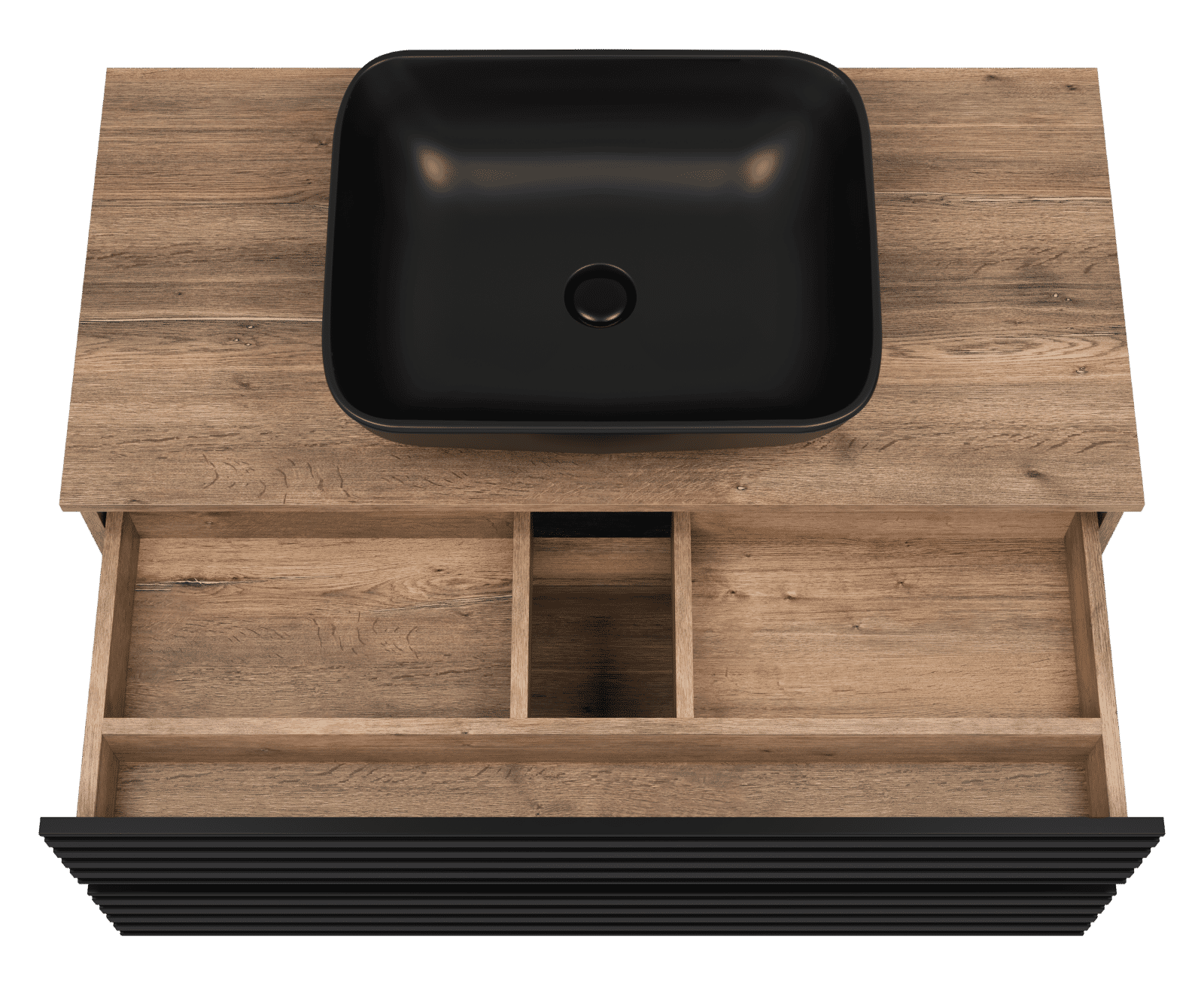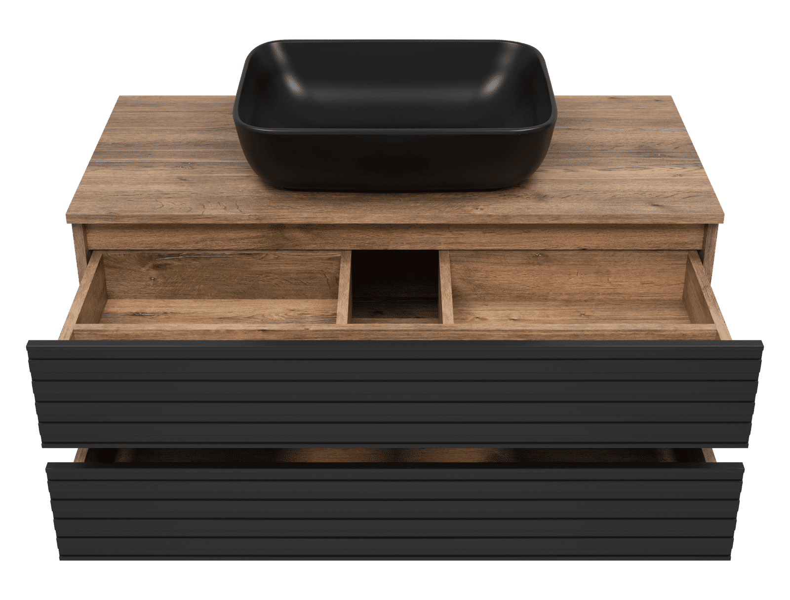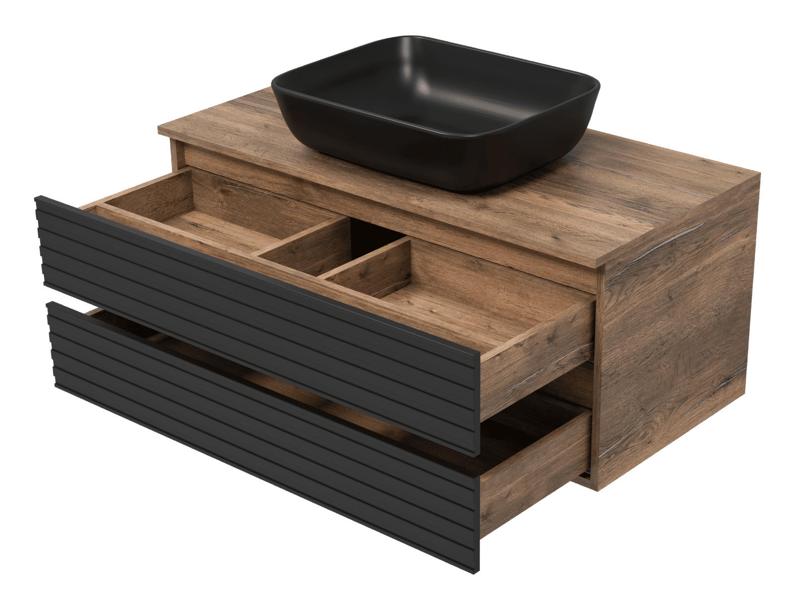 Тумба оснащена двумя выдвижными ящиками, которые установлены на направляющих скрытого монтажа с доводчиками. Верхний ящик разделен на несколько отсеков перегородками. Тумба поставляется с цельной столешницей без отверстий, что позволяет выбрать удобное расположение накладной раковины.