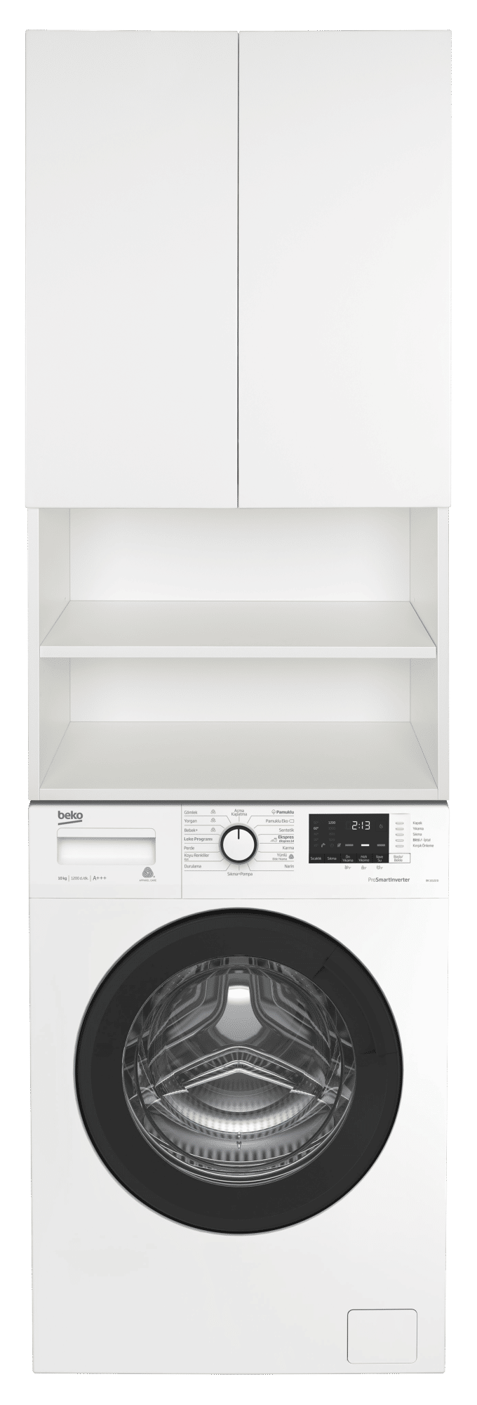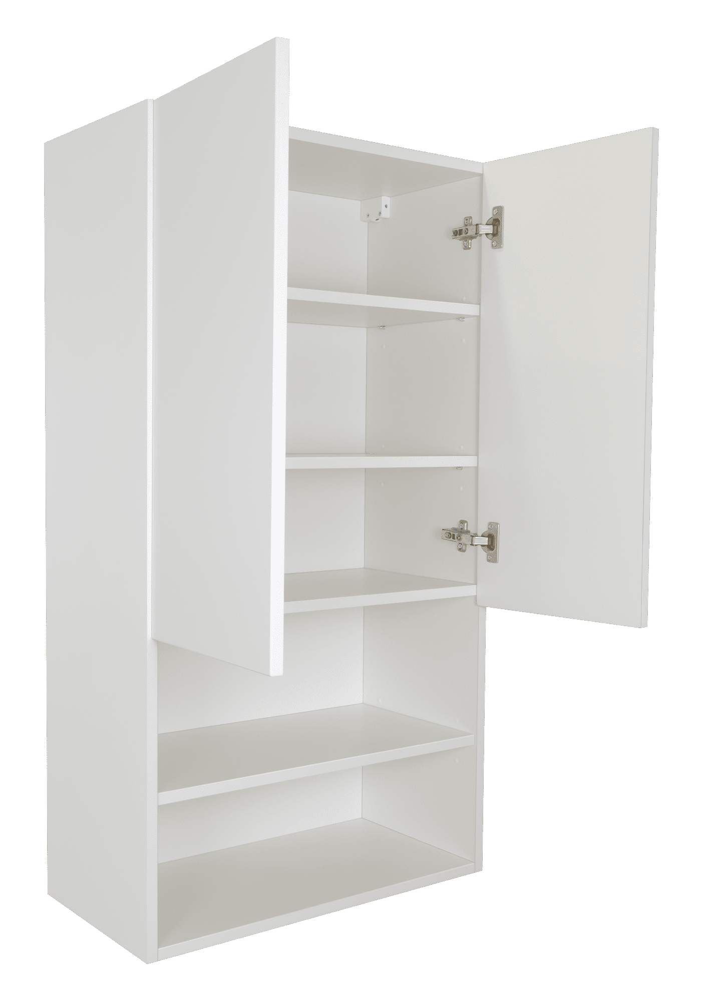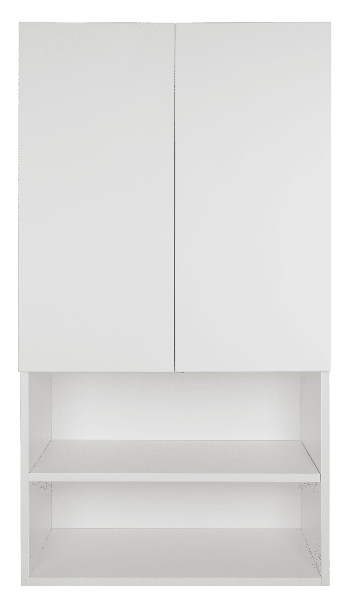 Шкаф предназначен для монтажа над стиральной машиной, поэтому имеют ширину 60 см (так же, как и крышка любой стиральной машины с фронтальной загрузкой). Верхняя часть шкафа разделена двумя распашными фасадами, а нижняя часть комплектуется двумя открытыми полками .