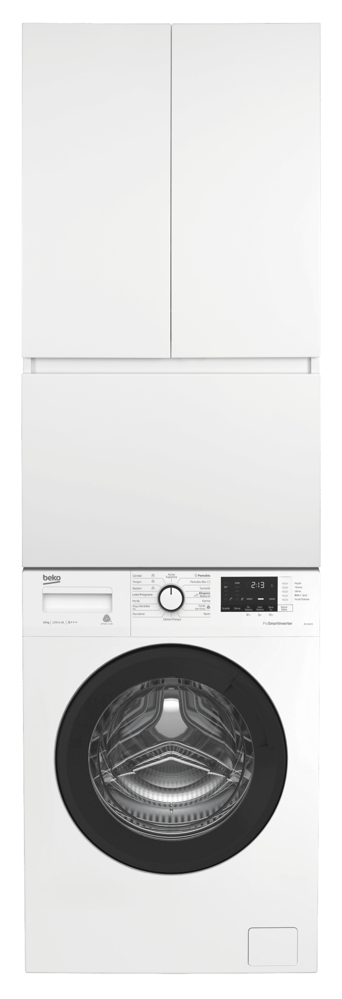 Шкаф предназначен для монтажа над стиральной машиной, поэтому имеют ширину 60 см (так же, как и крышка любой стиральной машины с фронтальной загрузкой). Верхняя часть шкафа разделена двумя распашными фасадами, а нижняя часть комплектуется откидной дверцей с бельевой корзиной.