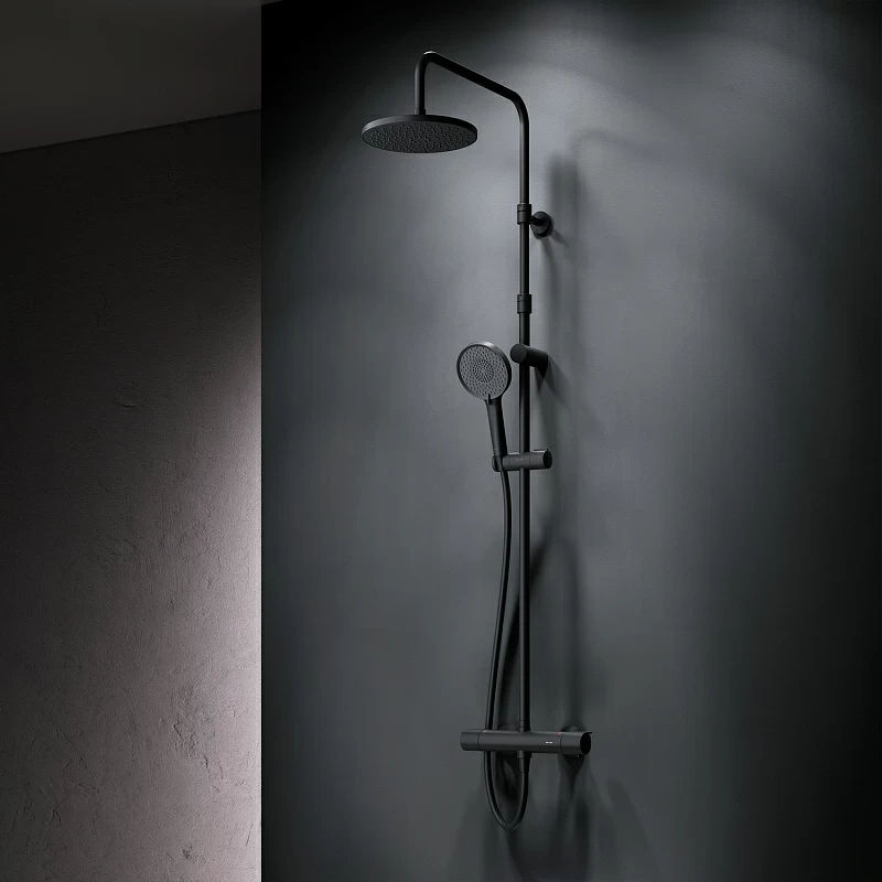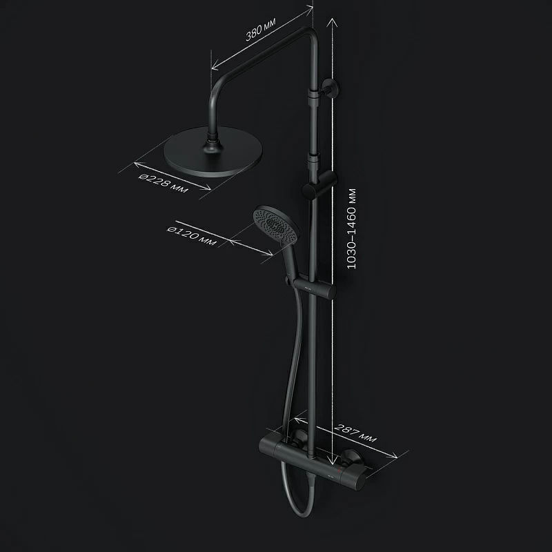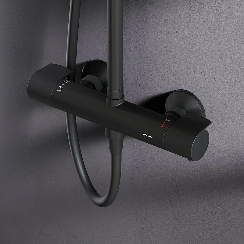 В комплектацию душевой системы входят: тропический душ, ручной душ, смеситель с термостатом, эксцентрики, держатели штанги и душа. Длина душевой штанги — 103-146 см. Длина душевого шланга — 175 см. Размер ручного душа — 12 см. Диаметр верхнего душа — 22,8 см.