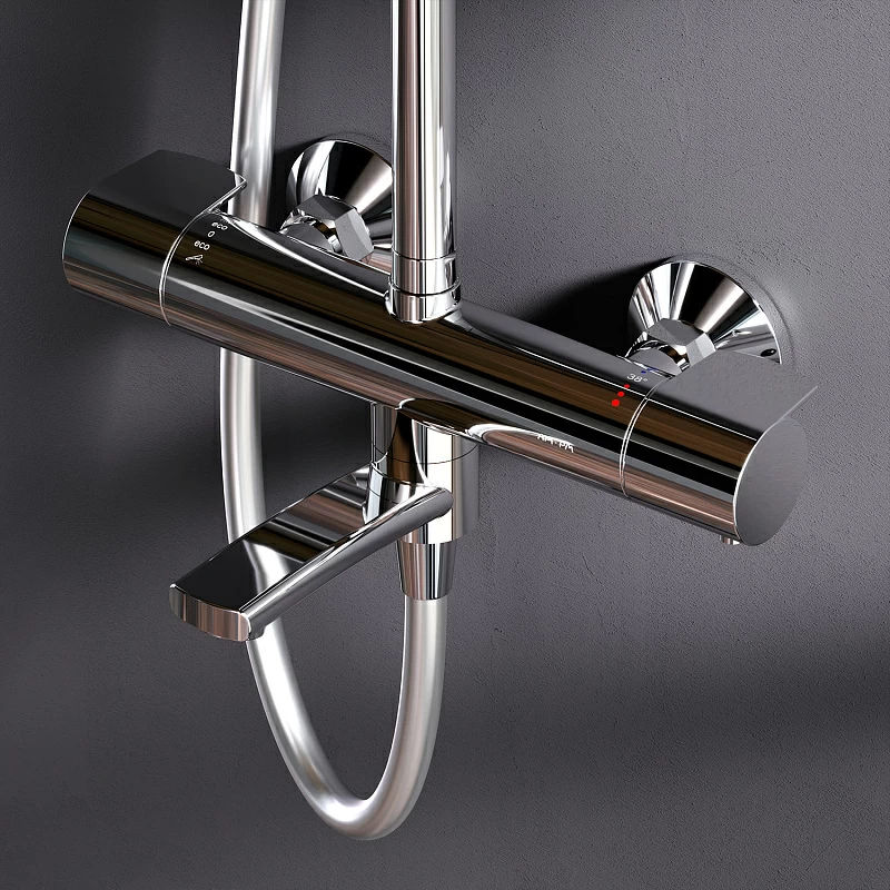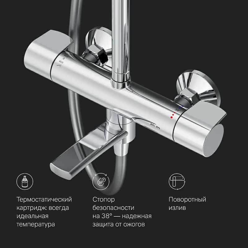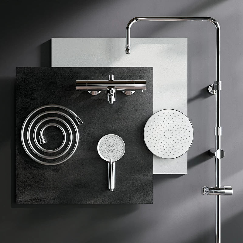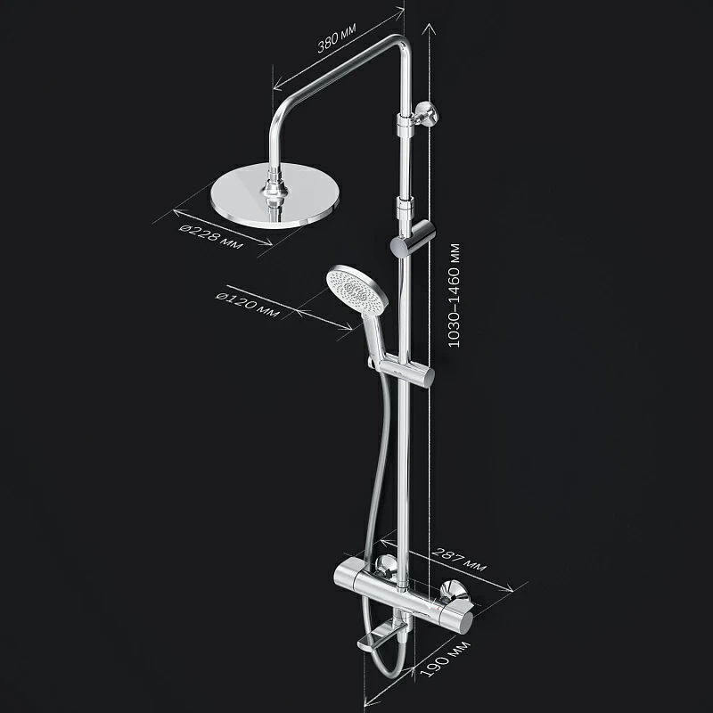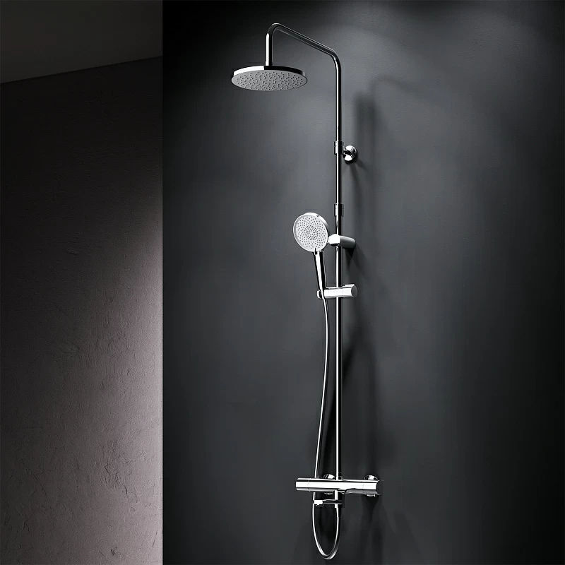 В комплектацию душевой системы входят: тропический душ, ручной душ, смеситель с термостатом и изливом, эксцентрики, держатели штанги и душа. Длина душевой штанги — 103-146 см. Длина душевого шланга — 175 см. Размер ручного душа — 12 см. Диаметр верхнего душа — 22,8 см.