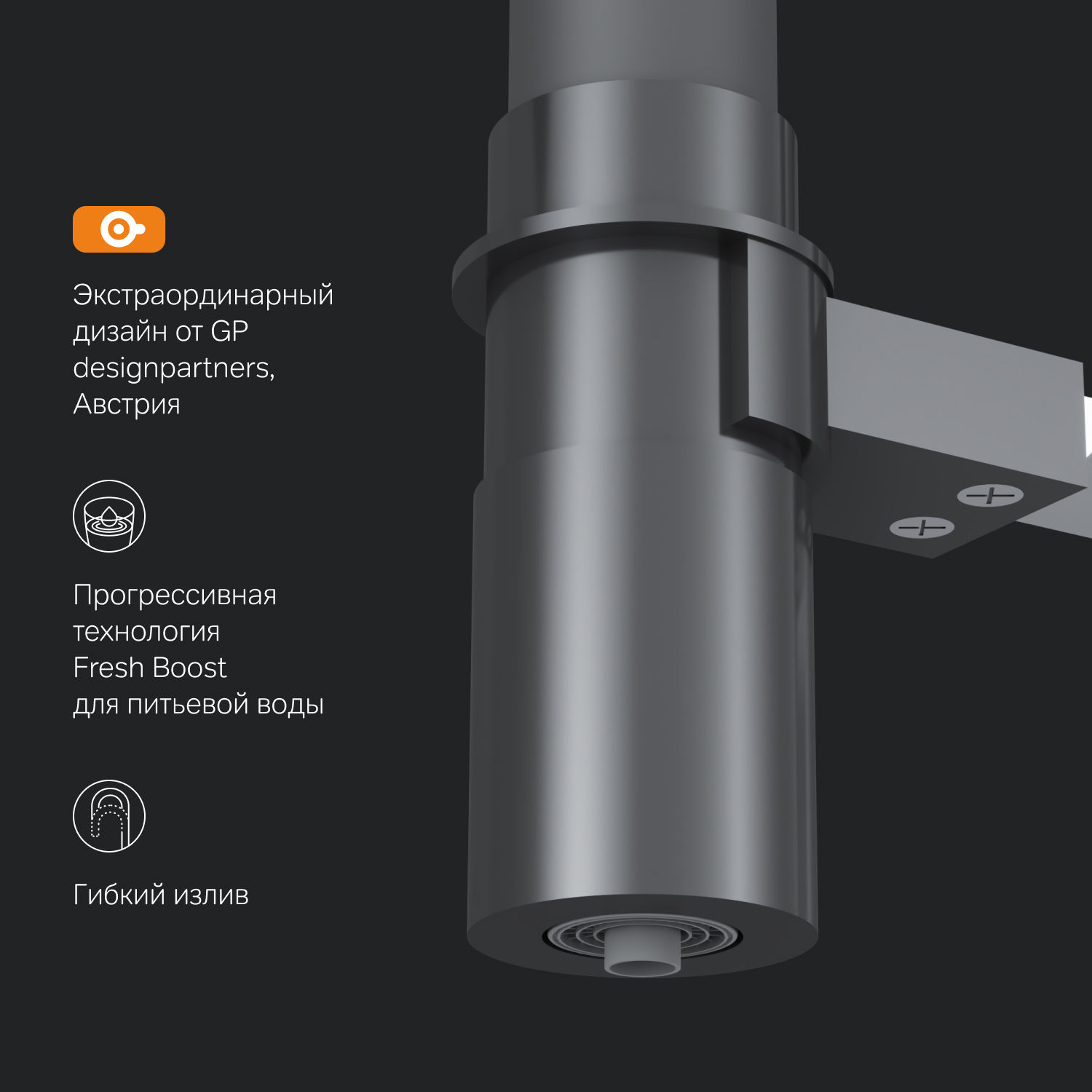 Безусловный лидер среди кухонных смесителей бренда — стильный и функциональный смеситель с профессиональным изливом и встроенным каналом для питьевой воды из культовой коллекции Like. Гибкий излив значительно расширяет зону использования смесителя гарантирует легкий уход за мойкой и наполнение емкостей любого размера. Излив устойчив к загрязнениям перегибам и внешним воздействиям. Смеситель имеет удобный магнитный притягиватель для фиксации излива. Также смеситель оснащен встроенным каналом для питьевой воды. Благодаря прогрессивной технологии Fresh Boost при вращении ручки на 90 градусов вы можете наслаждаться чистой питьевой водой. Для получения обычной воды просто управляйте смесителем привычным способом.