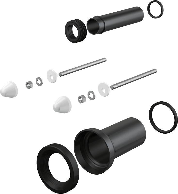 Патрубок сливной для подключения подвесного унитаза к стокам, полипропилен, Ø90 мм, с прокладками.