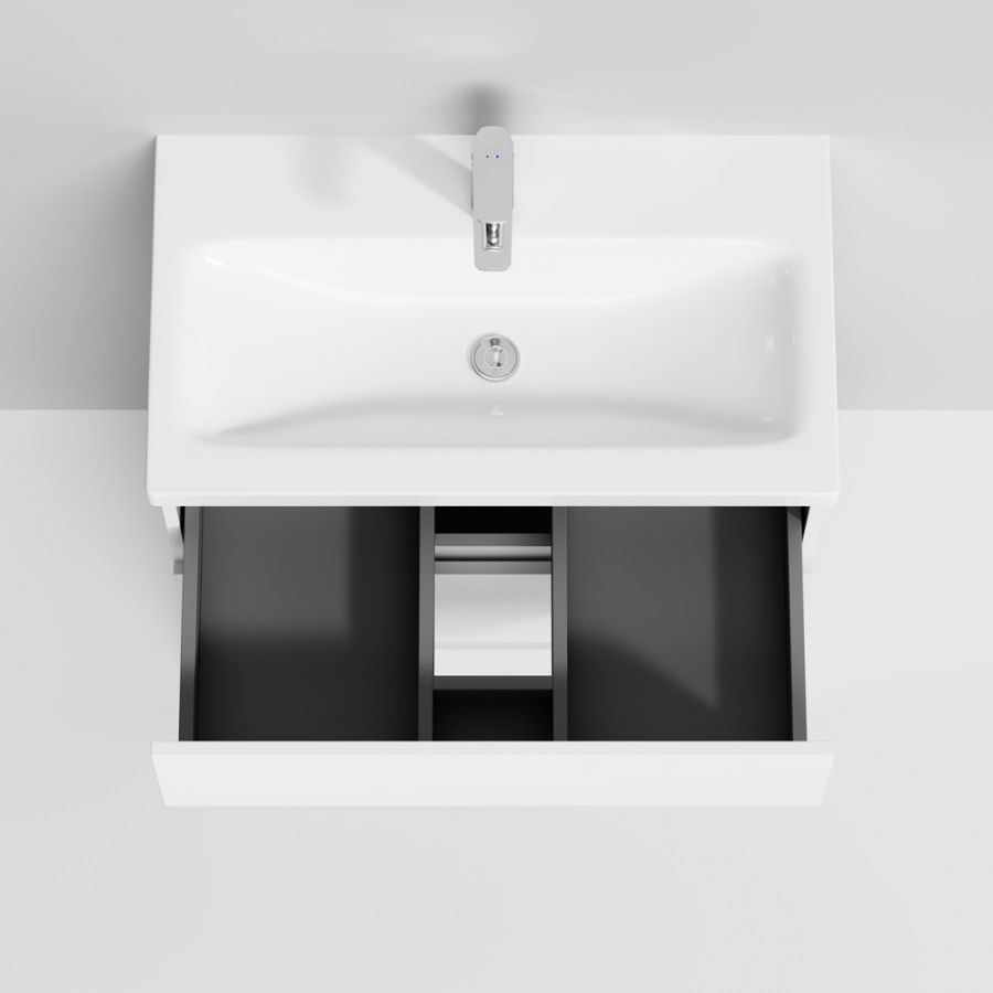 Тумба под раковину бренда AM.PM коллекции Gem S представлена в современном дизайне от европейской студии DanelonMeroni (Великобритания/Италия). Покрытие корпуса и фасада — ламинат. Уникальный нижний ящик базы может быть использован как: выдвижная подставка для детей, для удобного мытья рук (выдерживает нагрузку до 60 кг), дополнительная ниша для хранения (экономия пространства ванной комнаты). Ящики с внутренним антискользящим покрытием — европейский стандарт.