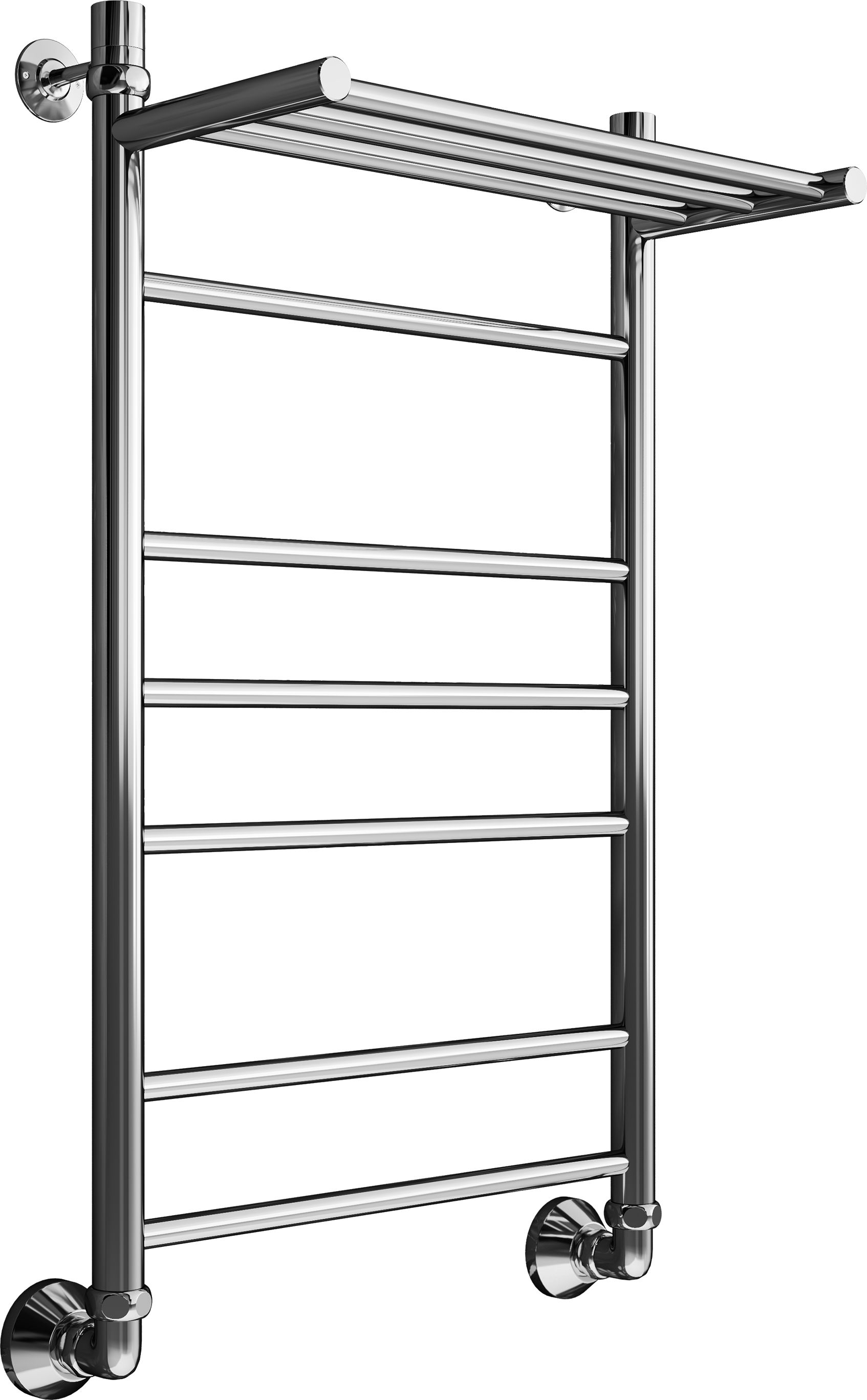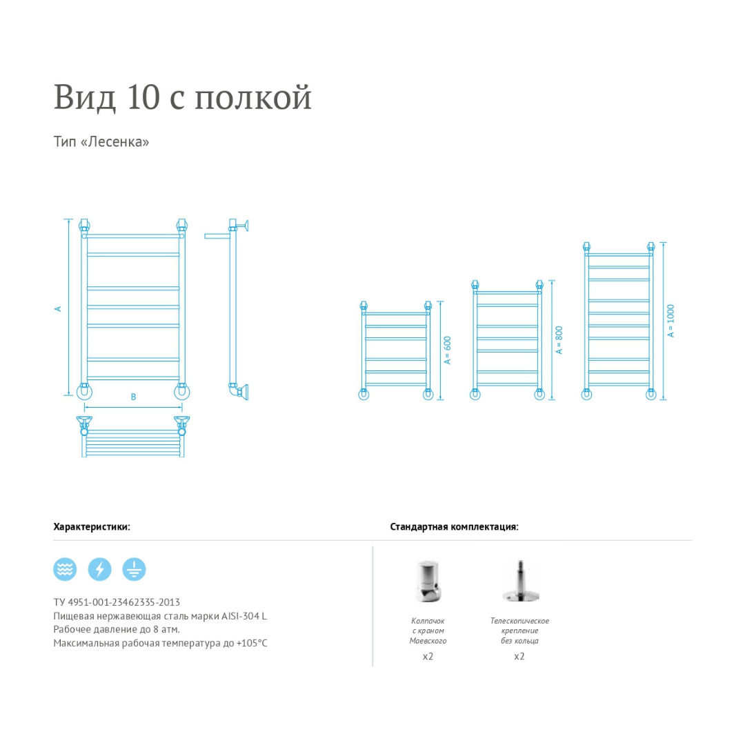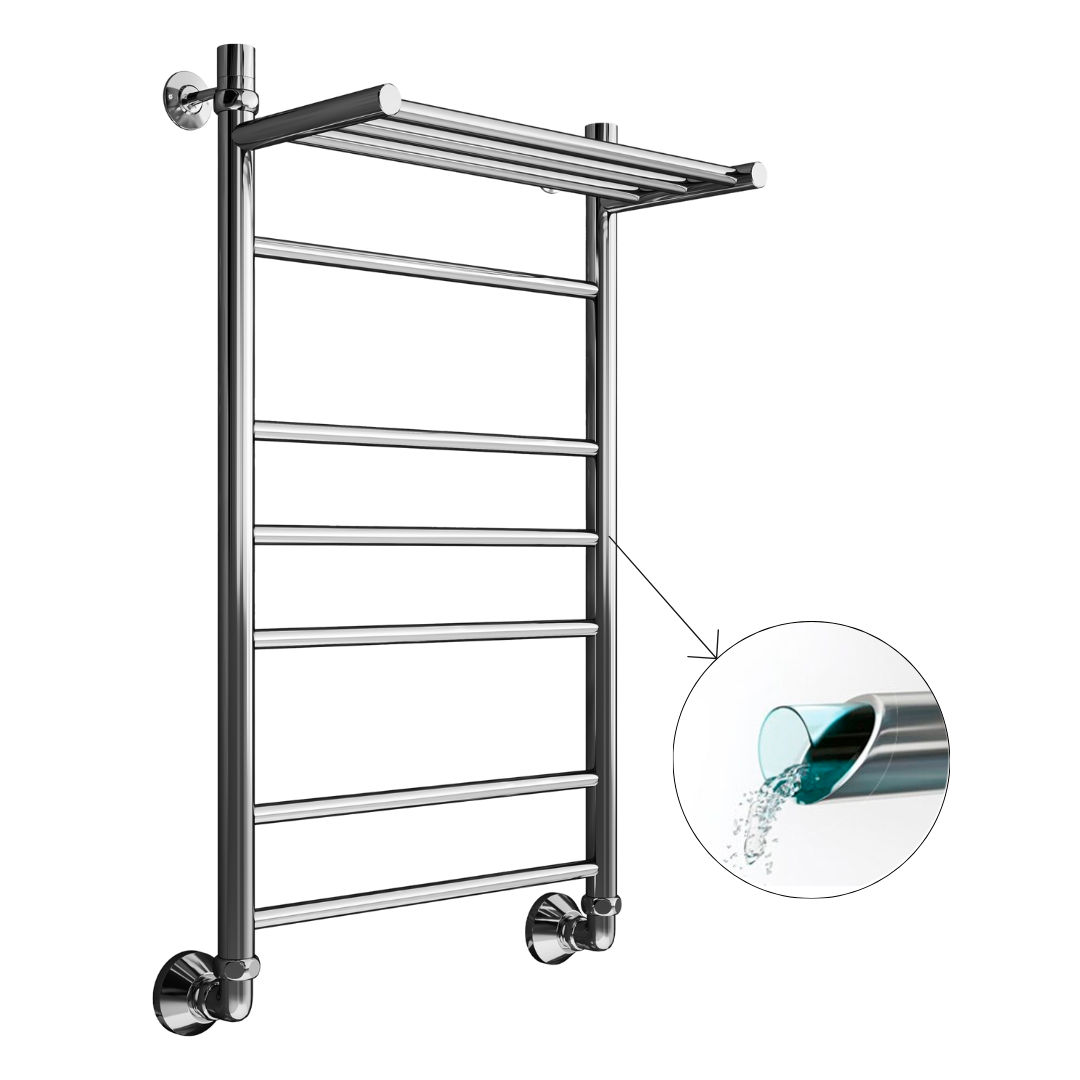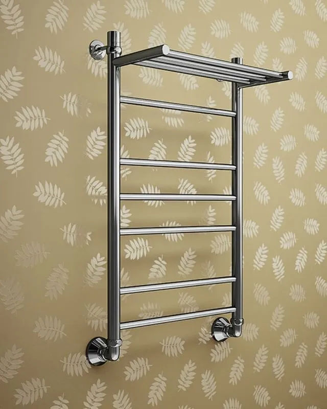 Водяной полотенцесушитель Маргроид Вид 10 с полкой изготовлен из из нержавеющей стали. Полотенцесушитель имеет самую распространенную и универсальную форму «лесенка».