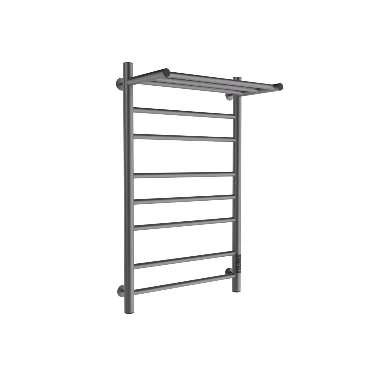 Электрический полотенцесушитель Маргроид Ferrum Вид 10 с полкой изготовлен из конструкционной стали. Устанавливается на 4 опоры. Внутри полотенцесушителя протянут нагревательный шнур. С правой стороны установлен диммер со световой индикацией, позволяющий выставить температуру и таймер нагрева.