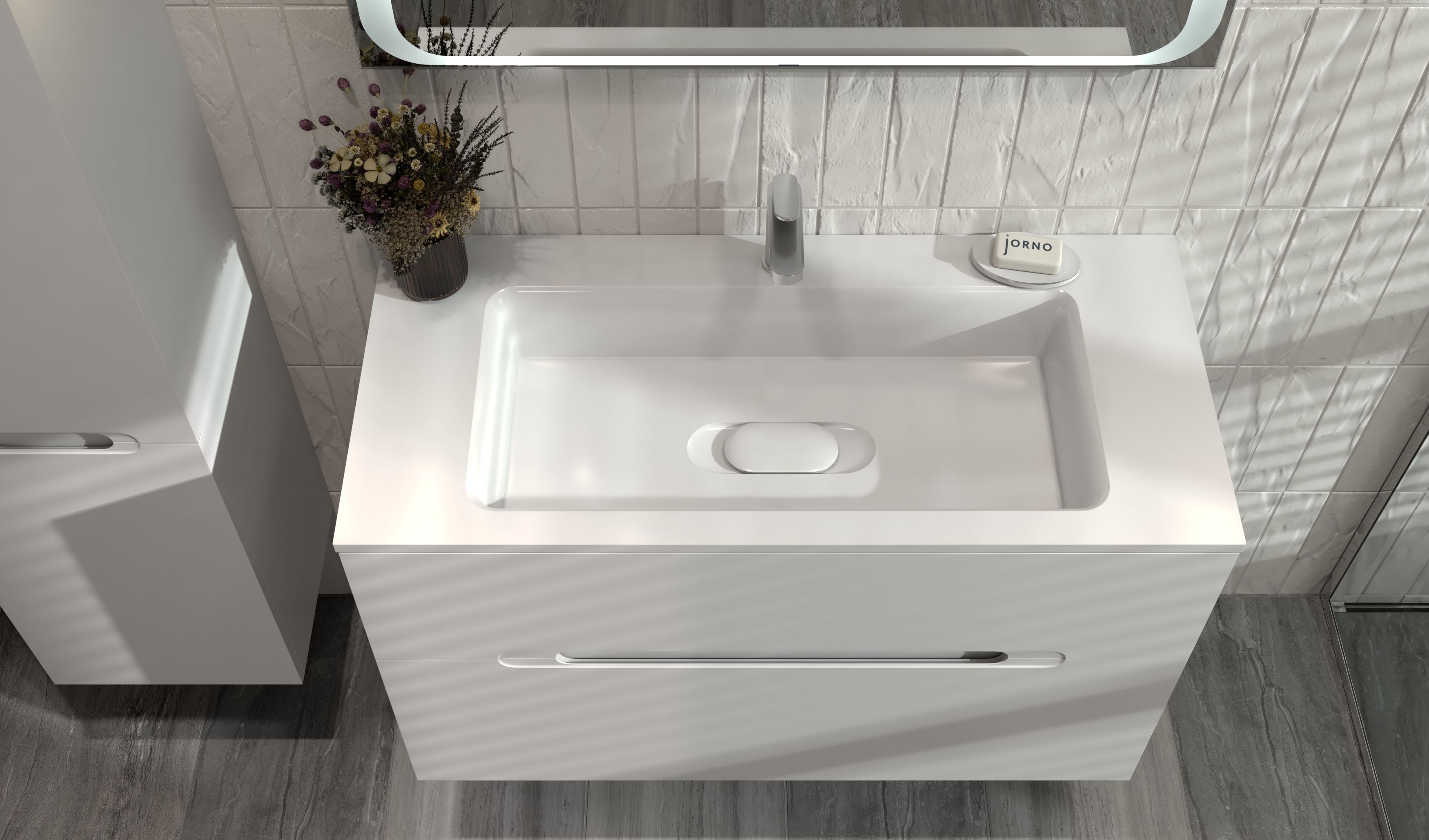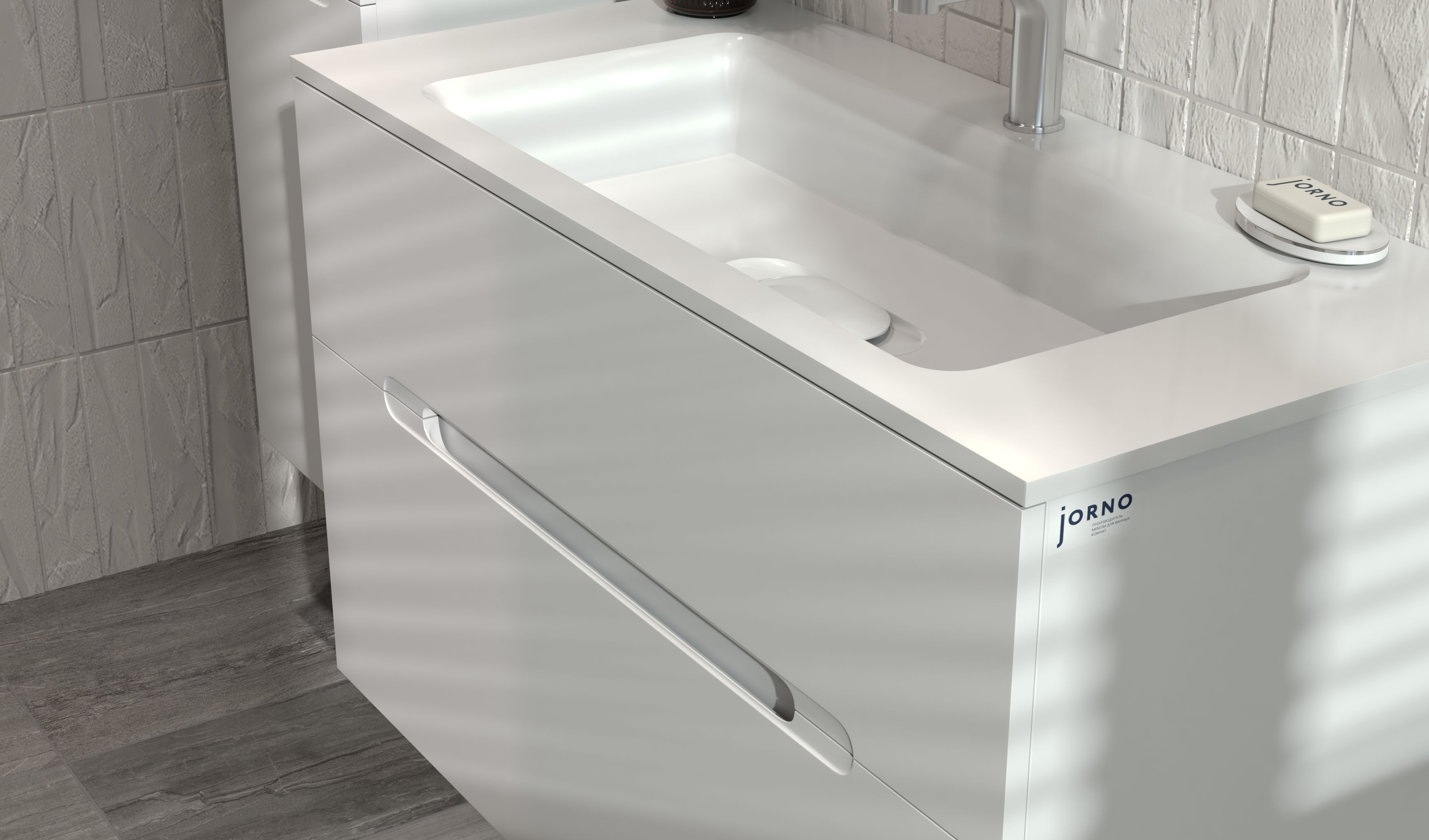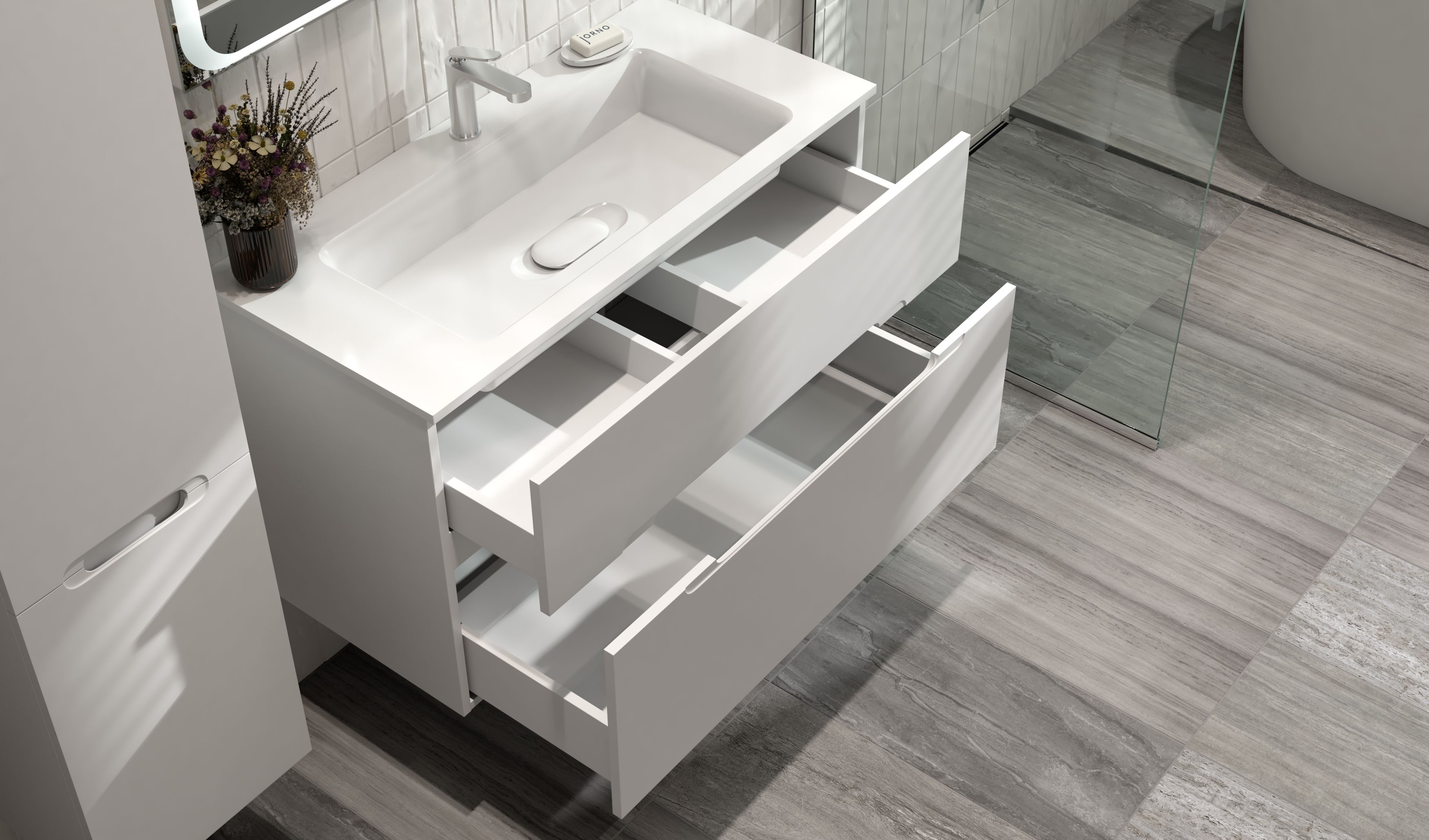 Jorno Modul 100 подвесная оснащена ящиками с системой плавного закрывания, которая гарантирует бесшумное и мягкое движение, предотвращая любые хлопки и обеспечивая комфорт при ежедневном использовании. Интегрированные ручки добавляют изящества дизайну, создавая ощущение цельности и минимализма. Декоративный вкладыш в раковину придает особый шарм, подчеркивая стиль и гармонию всей композиции.
