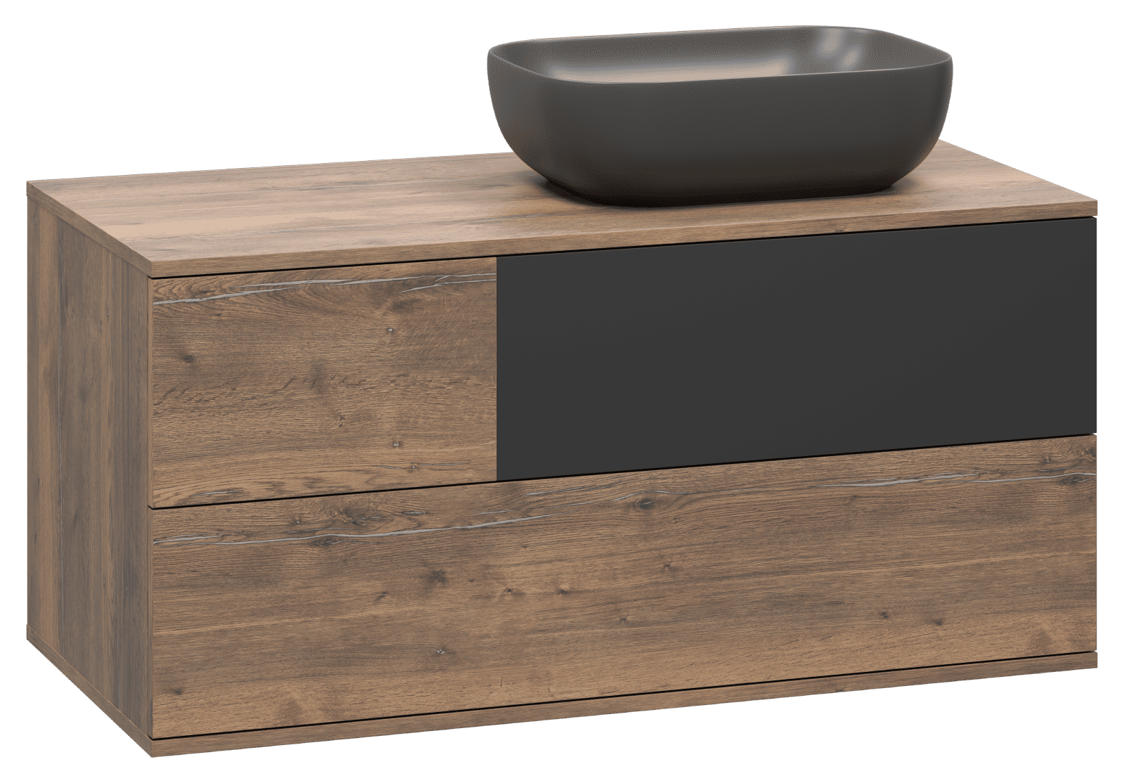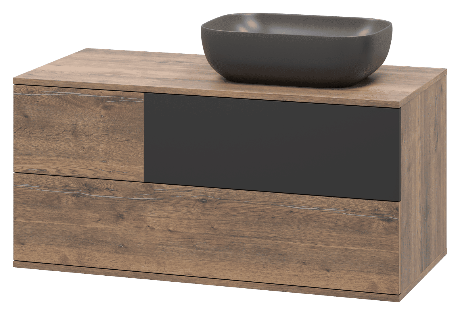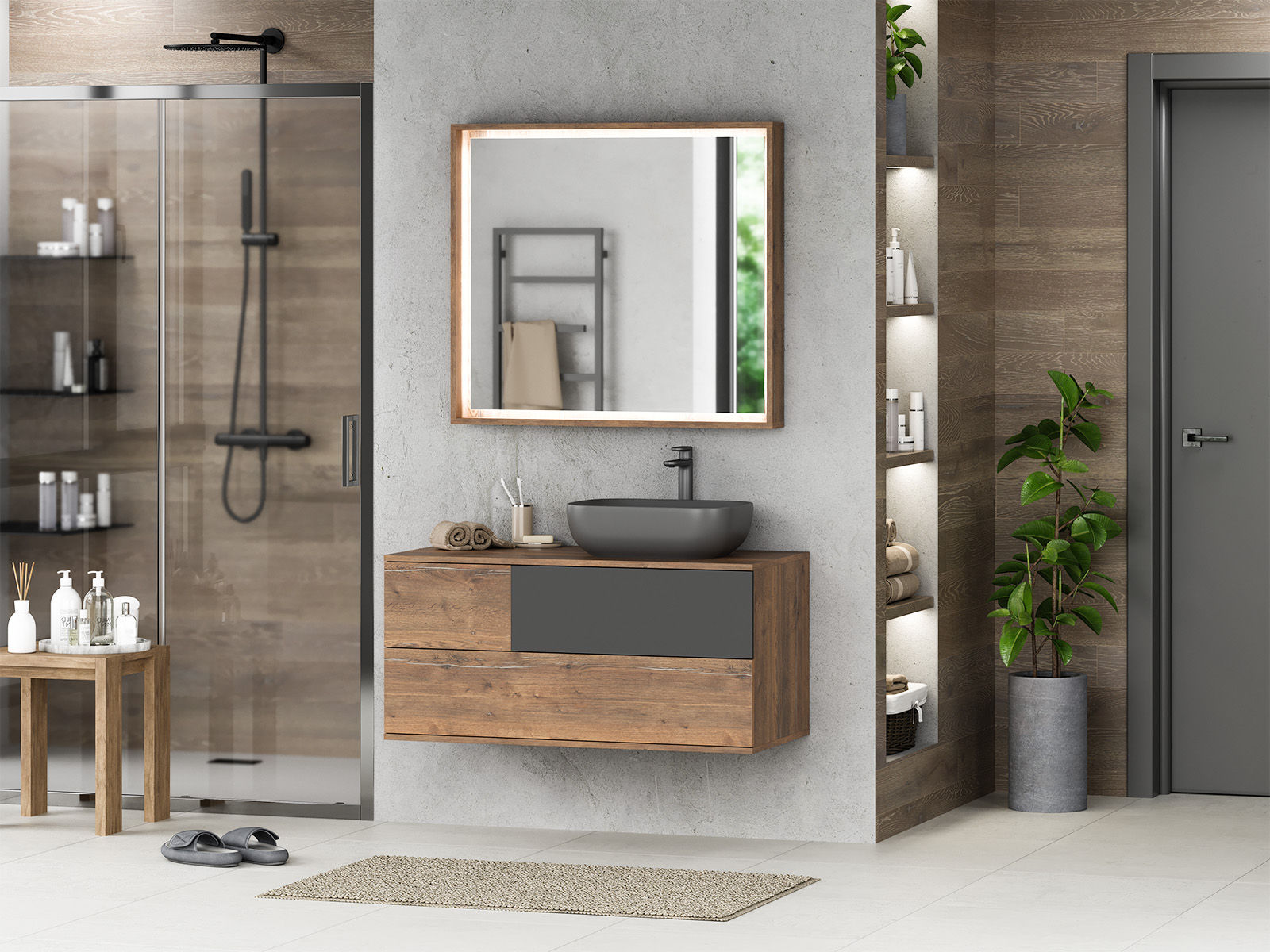 Мебель в ванную из коллекции Коломбо смотрится эффектно и дорого благодаря стильному дизайну и нестандартной подборке цветовой гаммы. В основе дизайна — минимализм, дополненный элементами этнического стиля. Оттеночная палитра двухцветная. В основе — имитация натуральной древесины в светло-коричневых тонах с ярко выраженными фактурными темными прожилками (Дуб галифакс олово). В качестве дополнительного цвета используется графит с матовой поверхностью. Такая комбинация не только придает мебели оригинальность и изысканность, но и является одним из модных трендов этого сезона.