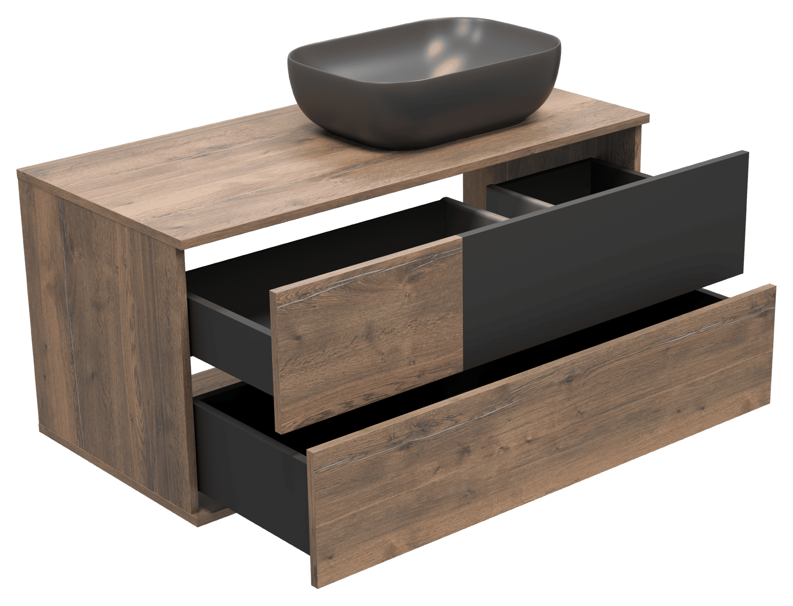 Благодаря подвесному монтажу мебель смотрится не такой громоздкой, как аналоги с напольным размещением. Наличие механизма «Push-to-Open» позволяет открывать ящики легким нажатием на фасад, а отсутствие внешней фурнитуры придает мебели современный вид.