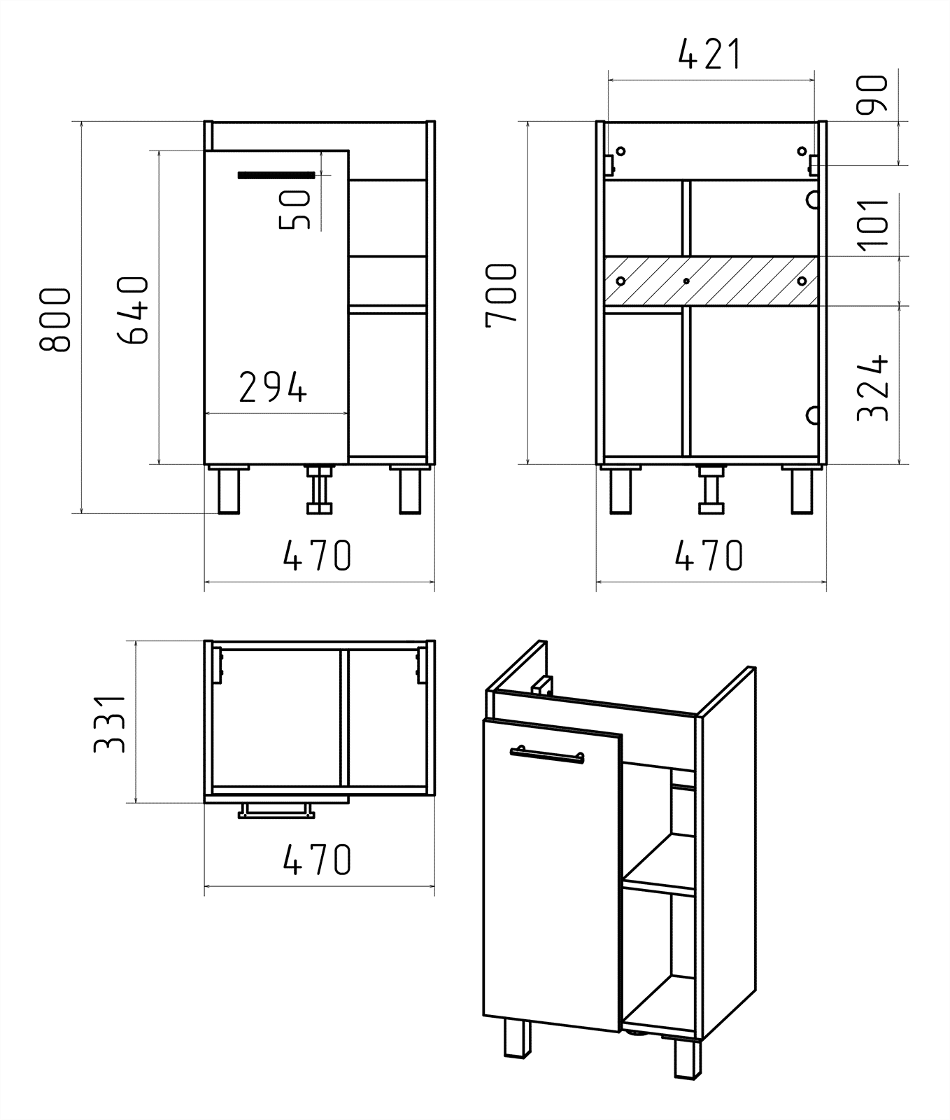 Тумба под раковину выполнена в классическом форм-факторе с напольной установкой. Тумба имеет один распашной фасад и две открытые полки. Ручки и ножки черного цвета отлично сочетаются с общей цветовой палитрой и подчеркивают изысканный стиль мебели.