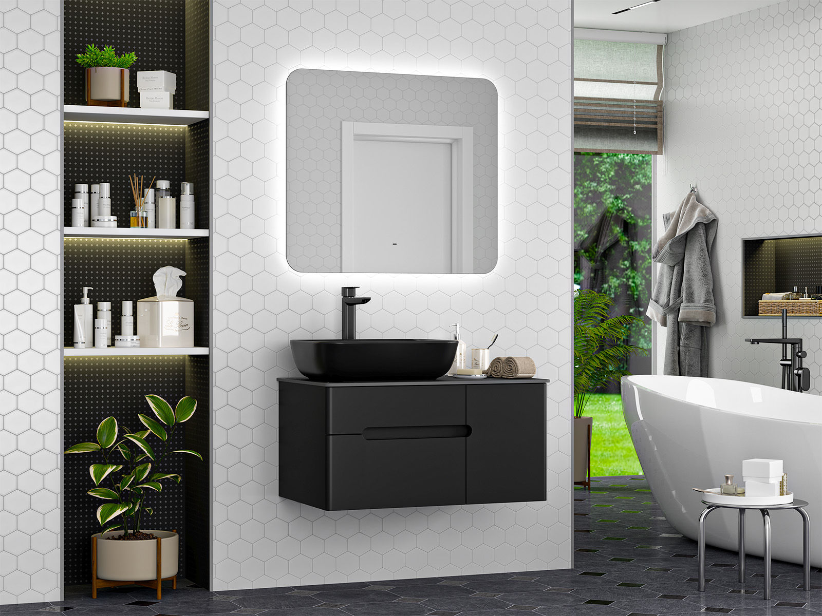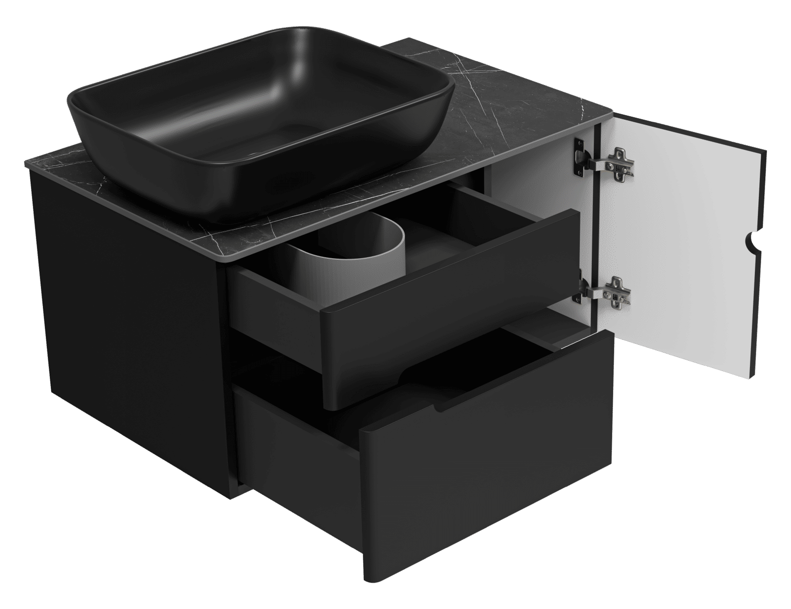Подвесной монтаж тумбы делает ее визуально более компактной, чем аналогичные модели с напольной установкой. На такую тумбу можно установить накладную раковину разного размера и формы. Внешняя фурнитура отсутствует, для удобного открывания фасадов есть специальные прорези в дверцах и ящиках. У тумбы есть два выдвижных ящика и одно отделение с распашной дверцей.