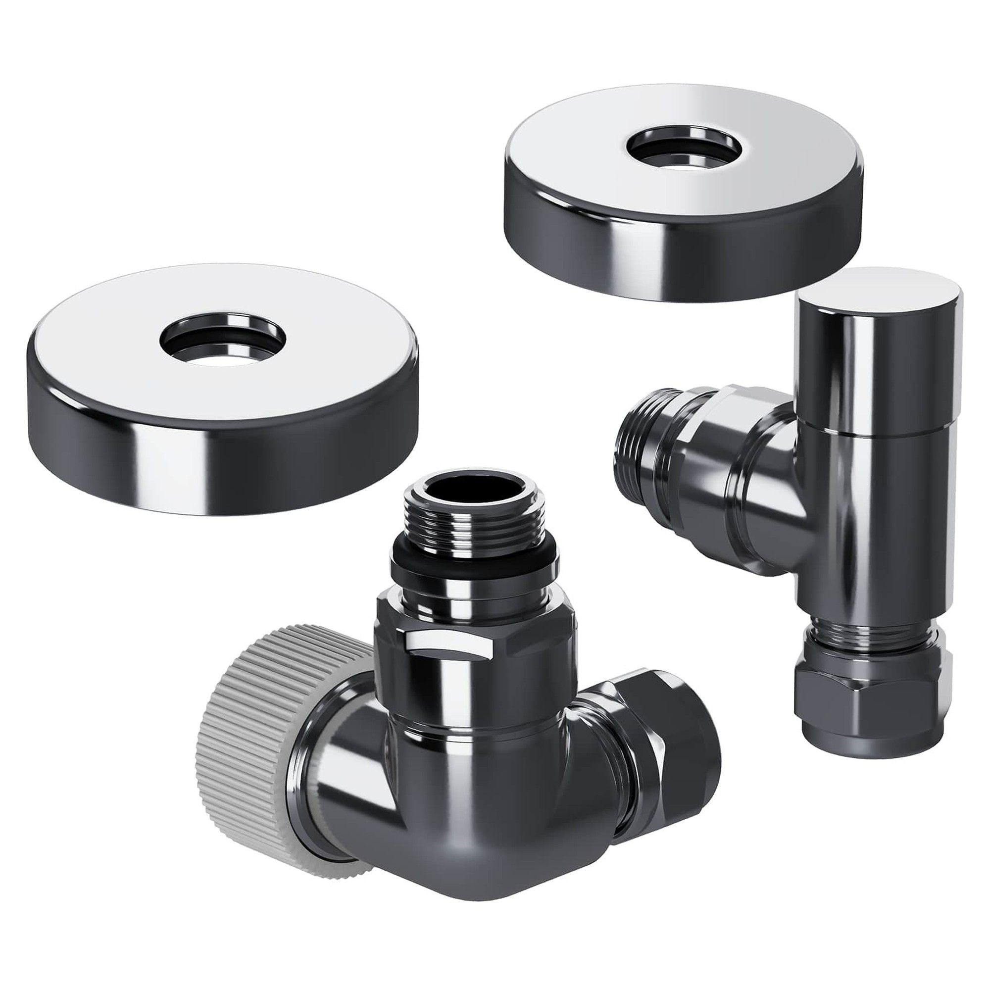 Набор подключается к радиатору через стандартное соединение 1/2”, а к системе отопления — с помощью латунной монтажной трубки диаметром 15 мм. В комплект входит все необходимое для чистового монтажа: термостатический клапан для подачи, запорный клапан для обратного трубопровода, две гайки-фитинга для надежного крепления к трубке и два цельных латунных отражателя с резиновым уплотнением диаметром 15,2 мм.