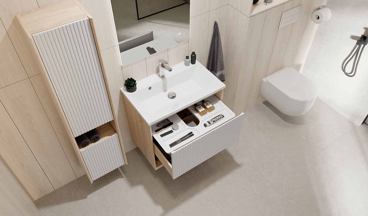 Стильное дизайнерское решение гармонично объединяет функциональность с материалами богатой текстуры, создавая ощущение премиум-класса. Особенностью коллекции является дополнительный выдвижной органайзер, предназначенный для удобного хранения мелочей, позволяющий поддерживать порядок без лишних усилий. Фурнитура выдерживает до 80 000 циклов работы и справляется с нагрузкой на ящики до 25 кг, обеспечивая плавную и надежную эксплуатацию на протяжении многих лет.