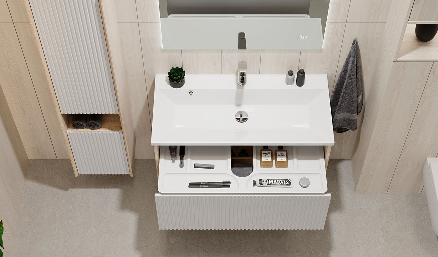 Стильное дизайнерское решение гармонично объединяет функциональность с материалами богатой текстуры, создавая ощущение премиум-класса. Особенностью коллекции является дополнительный выдвижной органайзер, предназначенный для удобного хранения мелочей, позволяющий поддерживать порядок без лишних усилий. Фурнитура выдерживает до 80 000 циклов работы и справляется с нагрузкой на ящики до 25 кг, обеспечивая плавную и надежную эксплуатацию на протяжении многих лет.