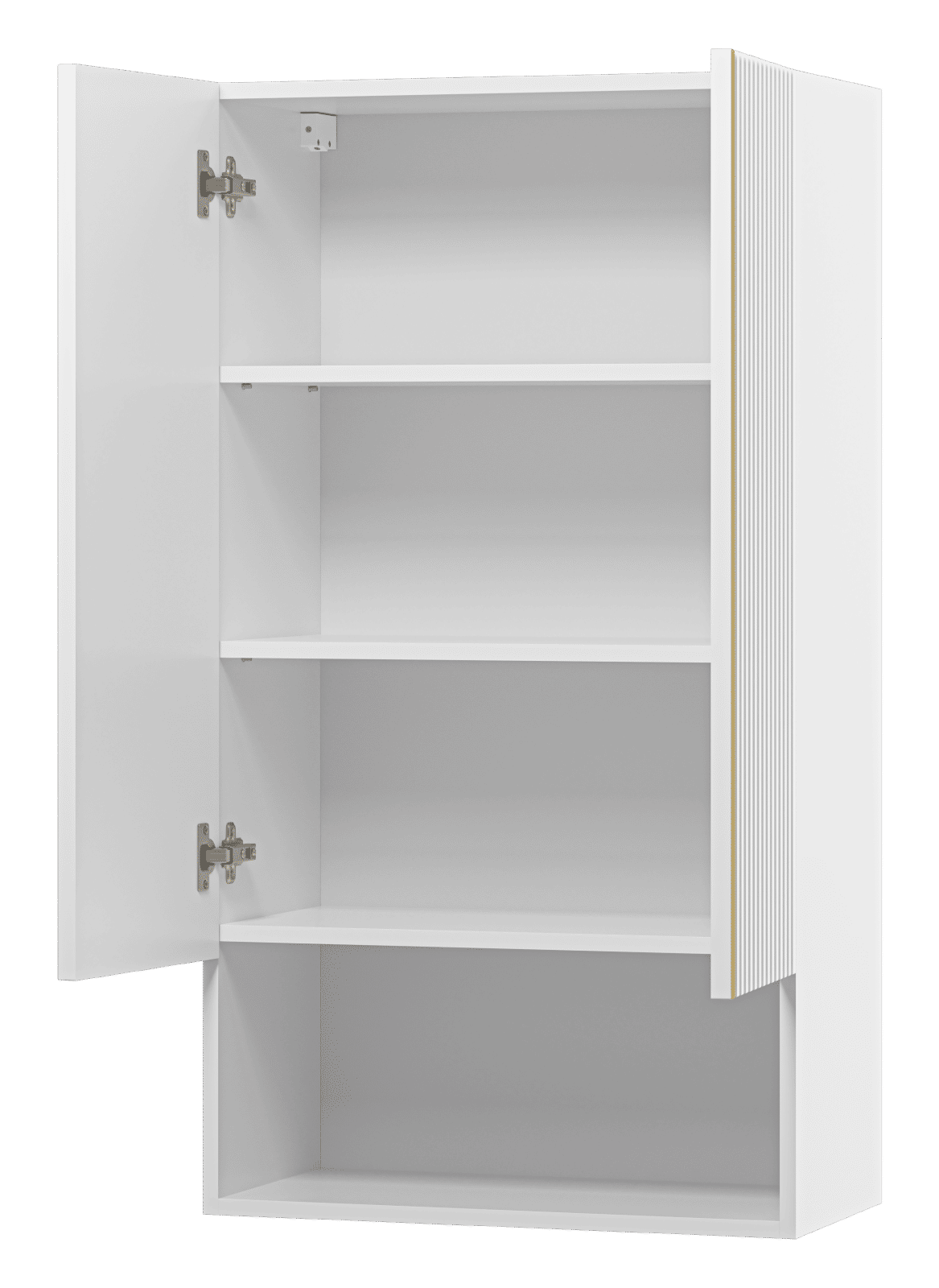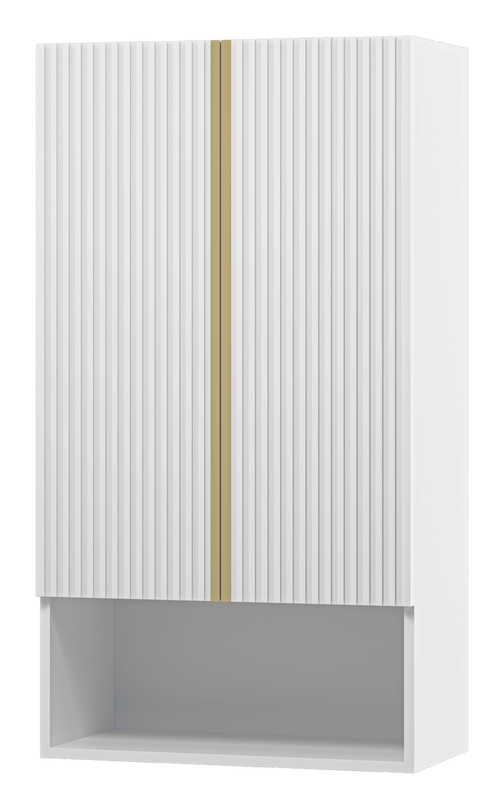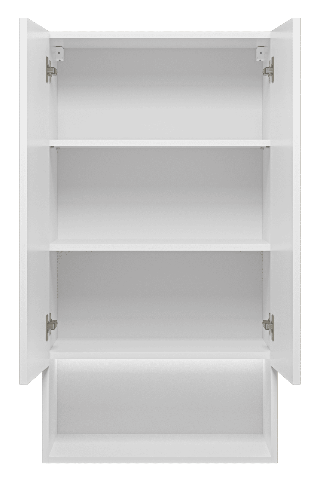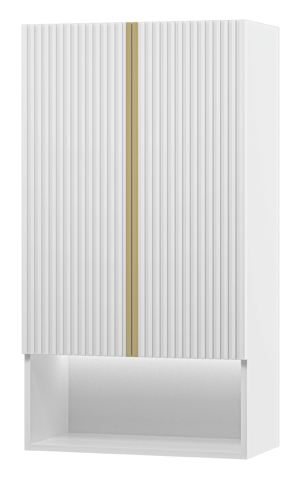 Шкаф имеет подвесную конструкцию, что позволяет экономить пространство. А открытая ниша со светодиодной подсветкой добавляет функциональности и элегантности.