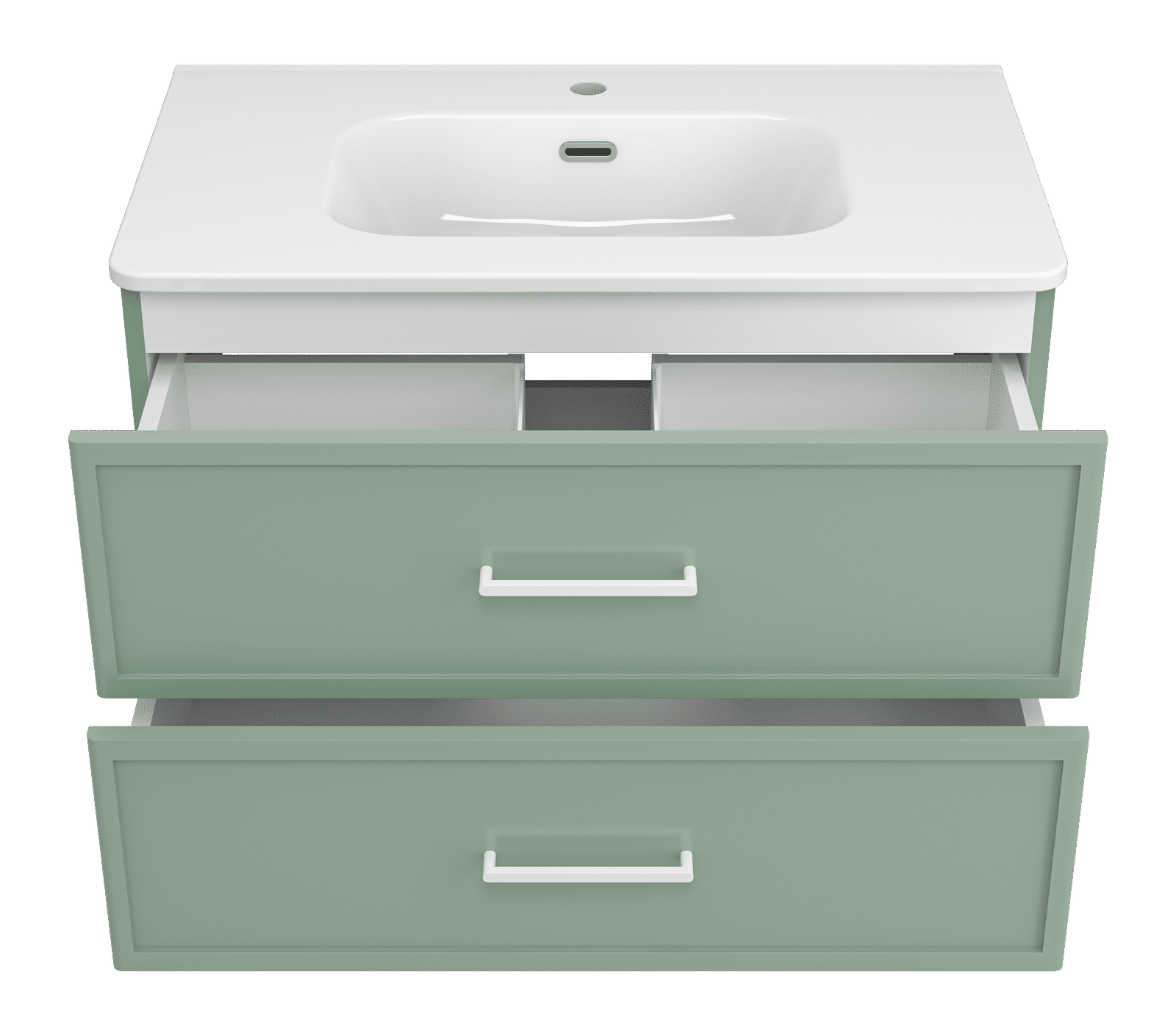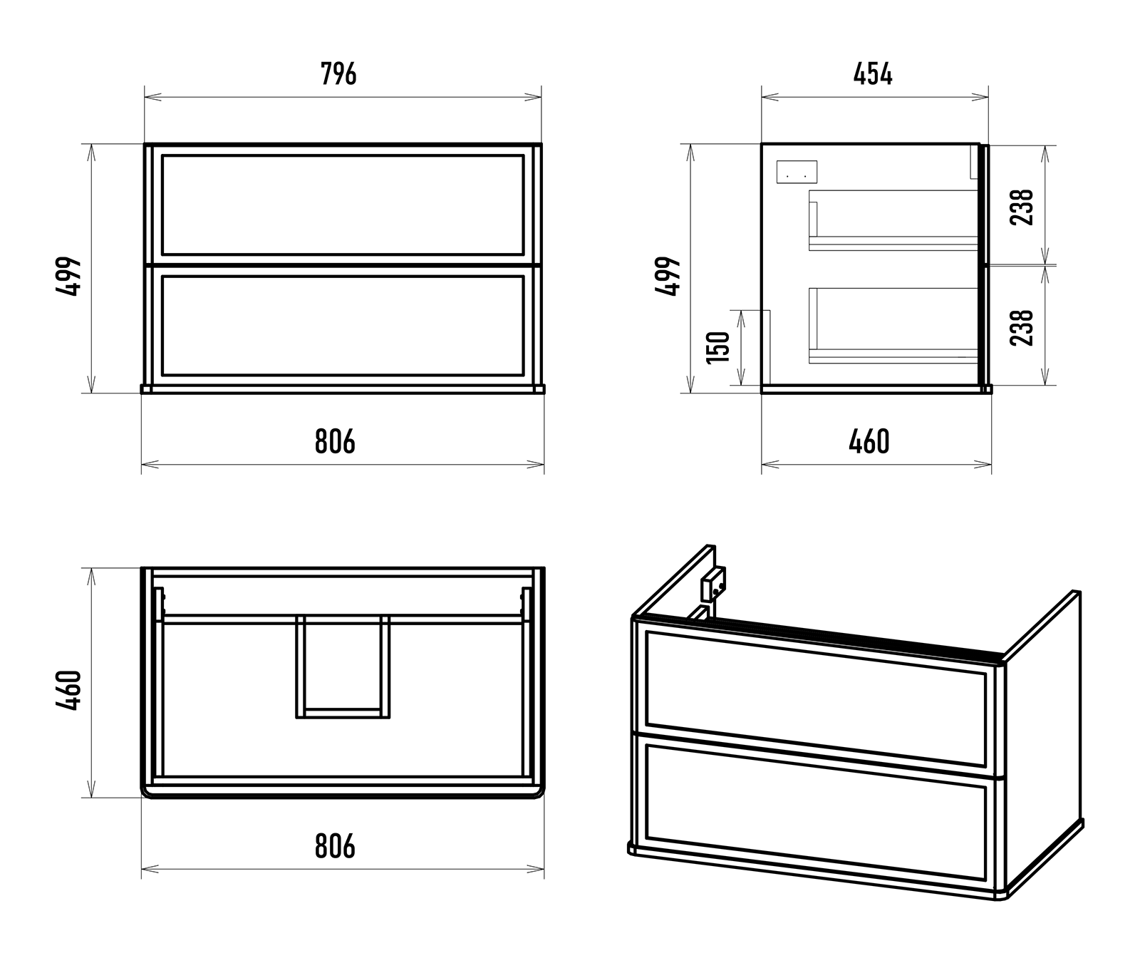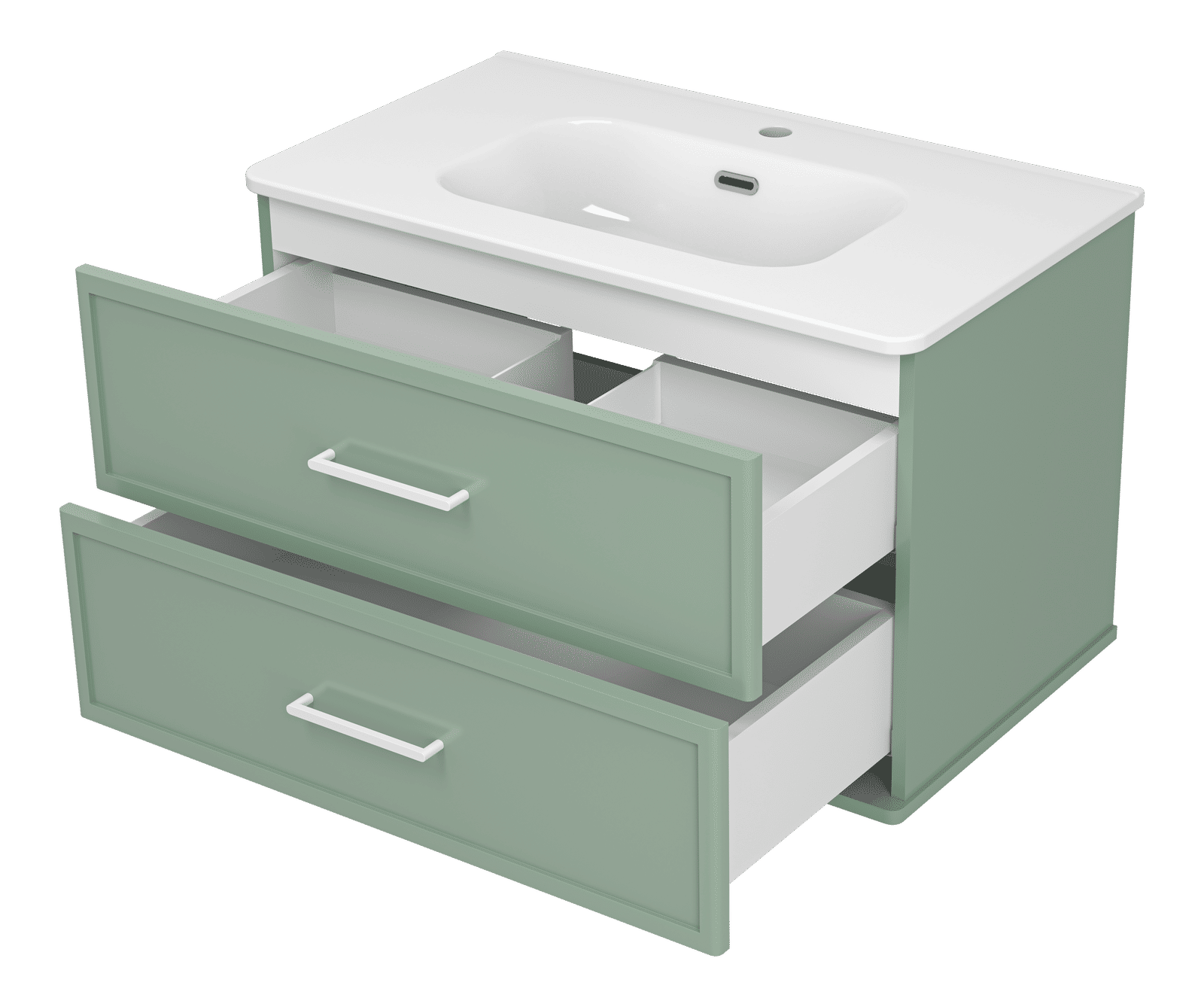 Практичность на первом месте: два выдвижных ящика, предназначенных для хранения разнообразных вещей, оснащены направляющими со скрытым монтажом и доводчиком, гарантируя плавное и бесшумное открытие для удобного доступа. Подвесной монтаж добавляет легкости и свободы пространству, позволяя легко убирать под тумбой и поддерживать чистоту.