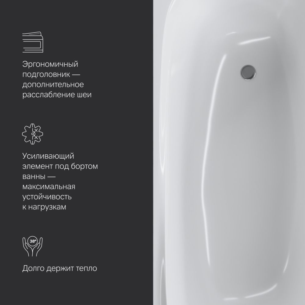 Необычайно вместительна: увеличенный внутренний объем при стандартных внешних габаритах благодаря ультратонким бортам делает процесс принятия ванны комфортным для человека любой комплекции.