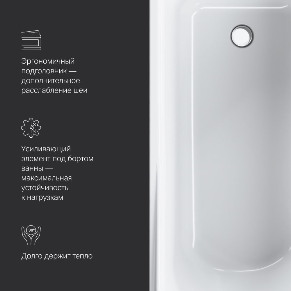 Необычайно вместительна: увеличенный внутренний объем при стандартных внешних габаритах благодаря ультратонким бортам делает процесс принятия ванны комфортным для человека любой комплекции.