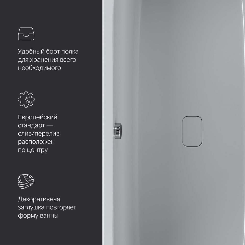 Характерный дизайн: сочетание широкого борта с одной стороны с ультра-тонким бортом с другой стороны создает неповторимую квинтэссенцию стиля. А декоративная заглушка слива, повторяющая форму самой ванны, станет яркой деталью в интерьере.