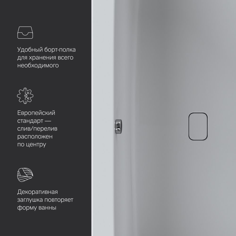 Характерный дизайн: сочетание широкого борта с одной стороны с ультра-тонким бортом с другой стороны создает неповторимую квинтэссенцию стиля. А декоративная заглушка слива, повторяющая форму самой ванны, станет яркой деталью в интерьере.