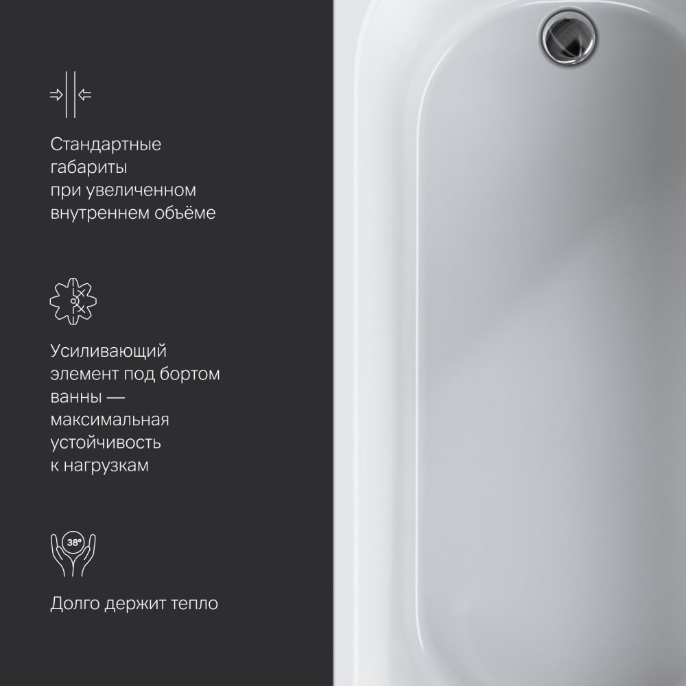 Компактная проекция 170×75 см позволяет вписать ванную даже в небольшое помещение. А универсальный дизайн подойдет как для современного, так и для классического интерьера.