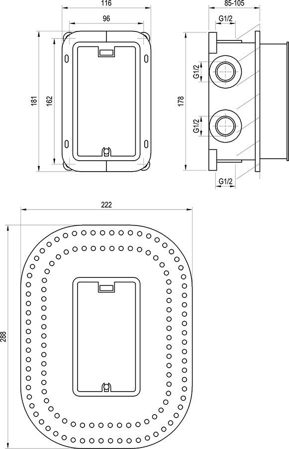 Выбирая монтажное основание R-box Multi RB 071.50, вы получаете надежную, удобную и эстетичную систему, которая экономит пространство в душевой зоне и облегчает процесс установки смесителя скрытого монтажа. В комплект входят все необходимые крепежные материалы для монтажа, за исключением подключения к водопроводу.