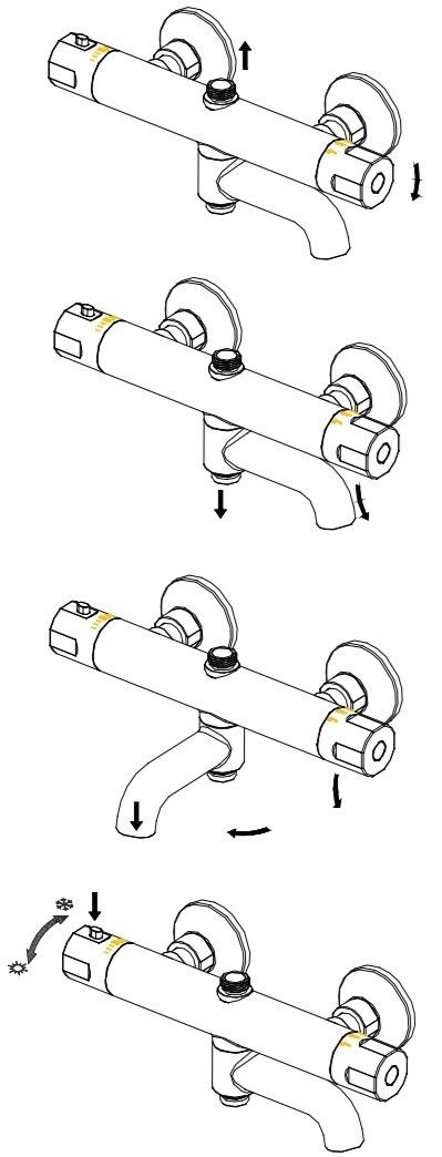 Поворотный кронштейн верхнего душа с регулировкой высоты 960–1500 мм. Длина душевого шланга — 150 см. Термостатический смеситель с ограничителем на 38°C: Vernet. Скрытый аэратор Neoperl. Запорно-переключающий вентиль.