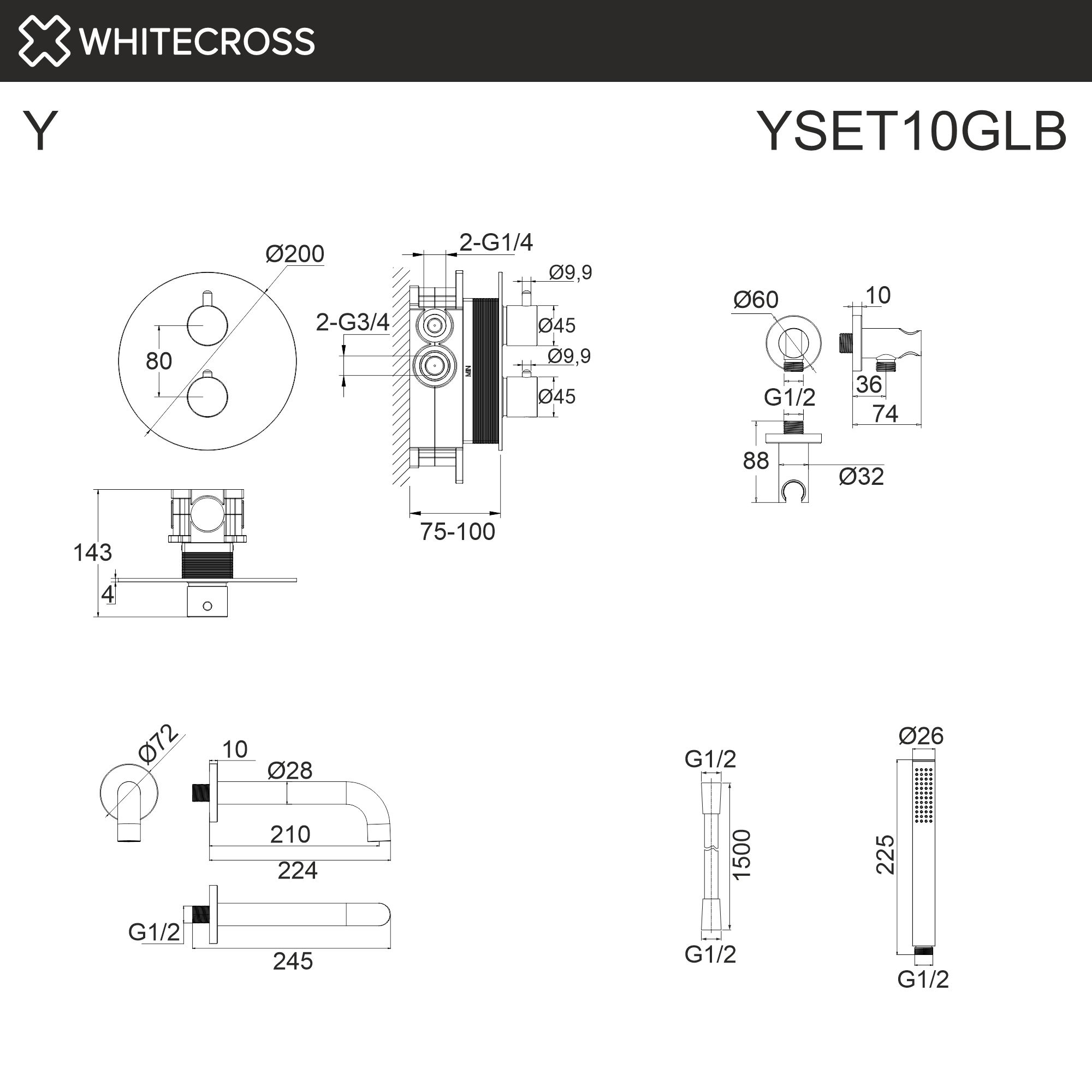 Состав комплекта: термостатический смеситель для ванны и душа скрытого монтажа на 2 потребителя — Y1236BL; излив для ванны — Y1200BL; ручной душ — MICRO-BL; душевой шланг — SHS150BL; соединение для шланга с настенным держателем для душа — Y1005BL.